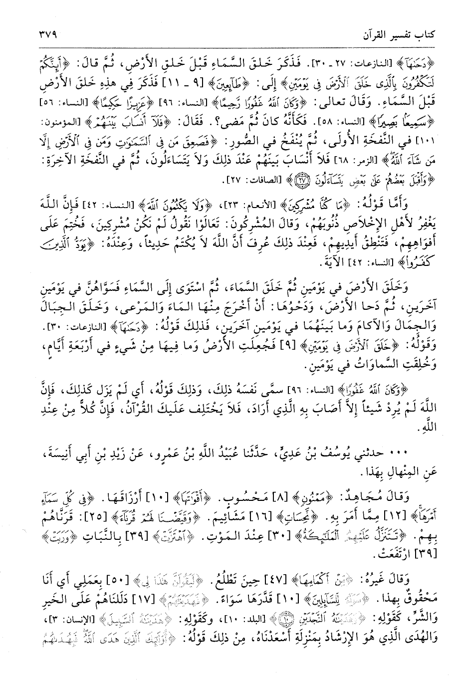 {دَحَاهَا} [النازعات: 27 - 30]. فَذَكَرَ خَلقَ السَّمَاءِ قَبْلَ خَلقِ الأَرْضِ، ثُمَّ قالَ: {أَئِنَّكُمْ لَتَكْفُرُونَ بِالَّذِي خَلَقَ الْأَرْضَ فِي يَوْمَيْنِ} إِلَى: {طَائِعِينَ} [فصلت: 9 - 11] فَذَكَرَ فِي هذِهِ خَلقَ الأَرْضِ قَبْلَ السَّمَاءِ. وَقَالَ تعالى: {وَكَانَ اللهُ غَفُورًا رَّحِيمًا} [النساء: 96] {عَزِيزًا حَكِيمًا} [النساء: 56] {سَمِيعًا بَصِيرًا} [النساء: 58]. فَكَأَنَّهُ كانَ ثُمَّ مَضى؟. فَقَالَ: {فَلاَ أَنسَابَ بَيْنَهُمْ} [المؤمنون: 101] في النَّفخَةِ الأُولَى، ثُمَّ يُنْفَخُ في الصُّورِ: {فَصَعِقَ مَن فِى السَّمَاوتِ وَمَن فِى الأرْضِ إِلَّا مَن شَاء اللهُ} [الزمر: 68] فَلاَ أَنْسَابَ بَينَهُمْ عَنْدَ ذلِكَ وَلاَ يَتَسَاءَلُونَ، ثُمَّ في النَّفخَةِ الآخِرَةِ: {وَأَقْبَلَ بَعْضُهُمْ عَلَى بَعْضٍ يَتَسَاءلُونَ (27)} [الصافات: 27].
