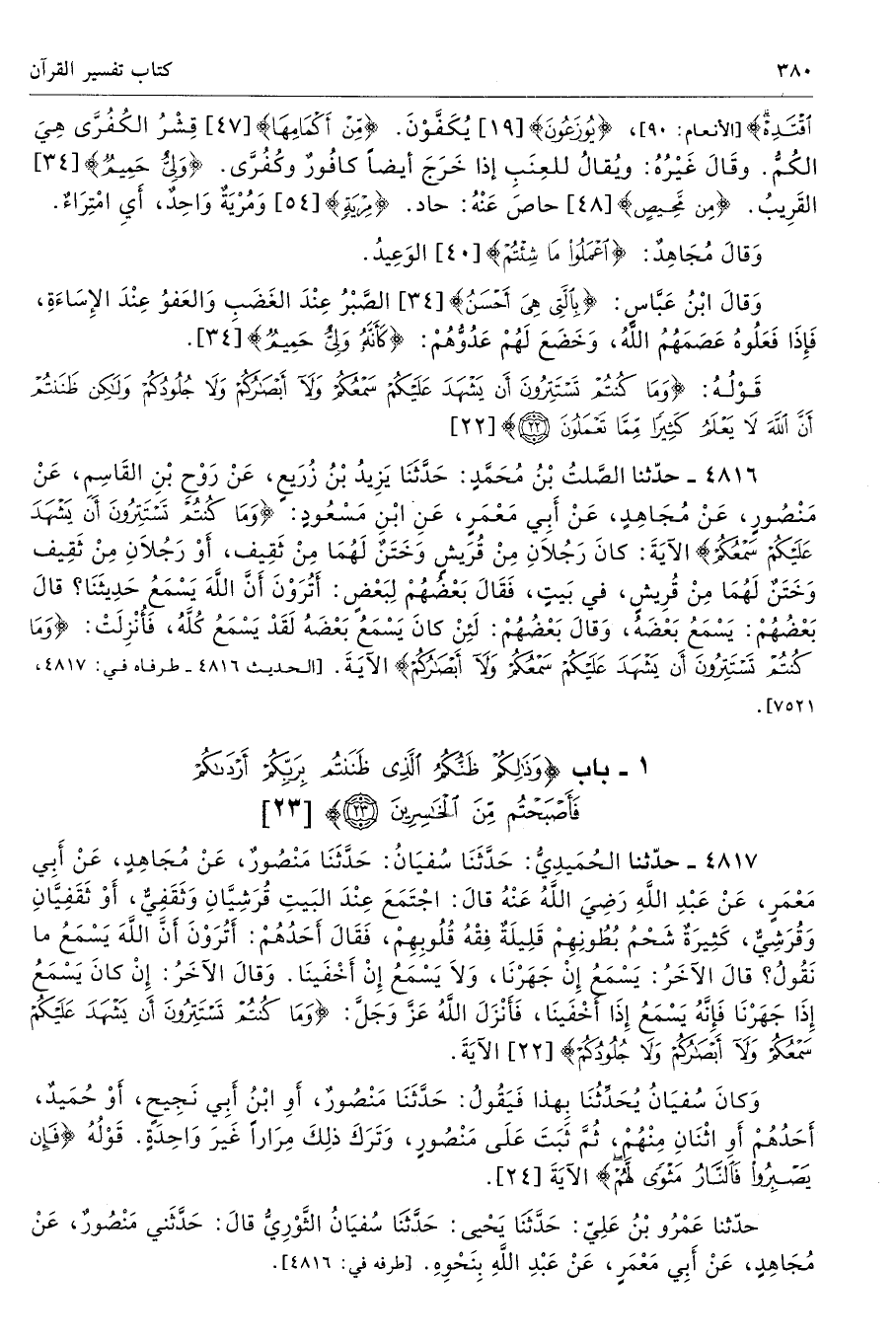 وَكَانَ سُفْيَانُ يُحَدِّثُنَا بِهَذَا فَيَقُولُ حَدَّثَنَا مَنْصُورٌ أَوِ ابْنُ أَبِى نَجِيحٍ أَوْ حُمَيْدٌ أَحَدُهُمْ أَوِ اثْنَانِ مِنْهُمْ، ثُمَّ ثَبَتَ عَلَى مَنْصُورٍ، وَتَرَكَ ذَلِكَ مِرَارًا غَيْرَ وَاحِدَةٍ. قَوْلُهُ {فَإِن يَصْبِرُواْ فَالنَّارُ مَثْوًى لَّهُمْ} الآيَةَ [24]. طرفاه 4816، 7521 - تحفة 9335