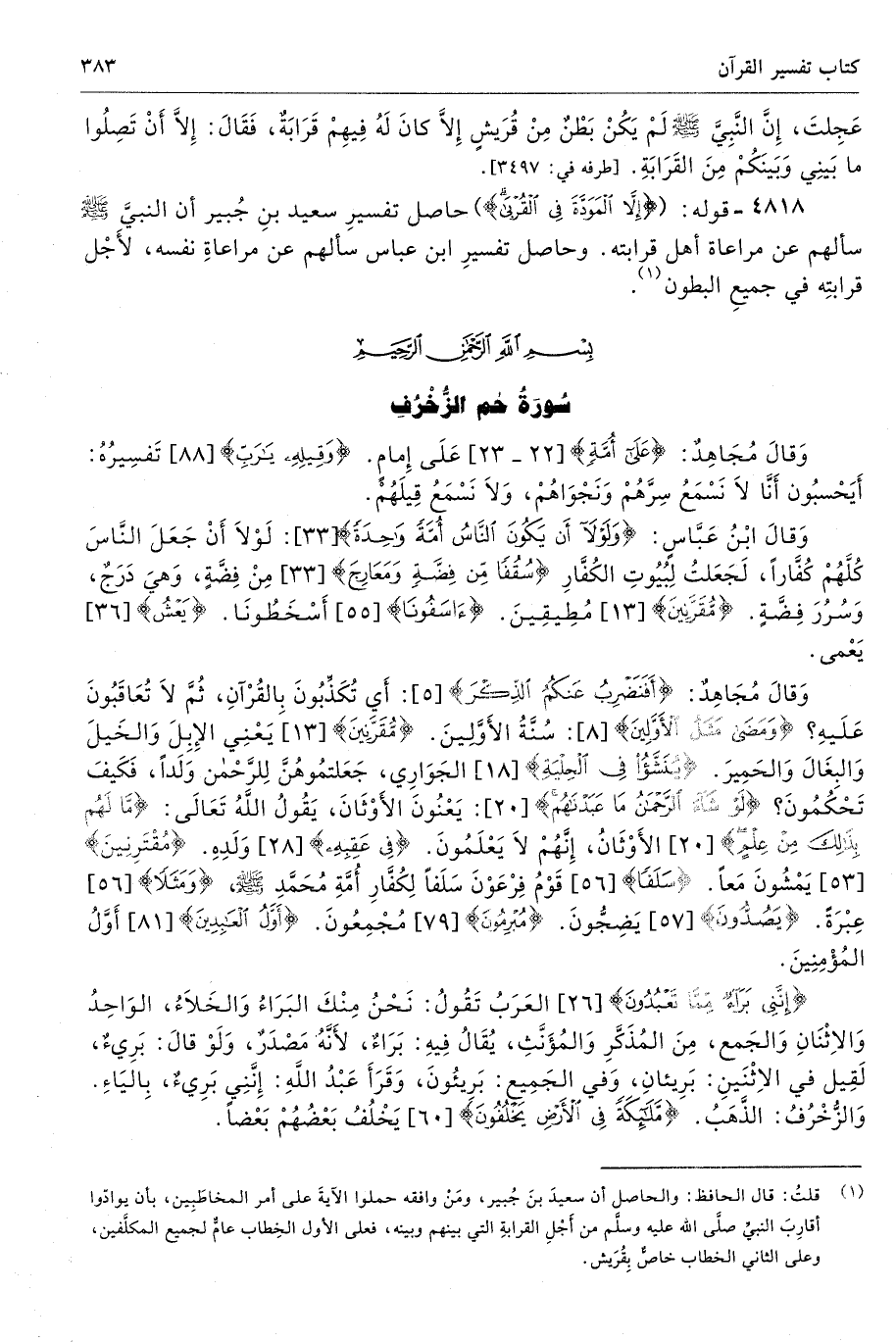 وَقالَ مُجَاهِدٌ: {أَفَنَضْرِبُ عَنكُمُ الذّكْرَ} [5]: أَي تُكَذِّبُونَ بِالقُرْآنِ، ثُمَّ لاَ تُعَاقَبُونَ عَلَيهِ؟ {وَمَضَى مَثَلُ الأوَّلِينَ} [8]: سُنَّةُ الأَوَّلِينَ. {مُّقَرَّنِينَ} [13] يَعْنِي الإِبِلَ وَالخَيلَ وَالبِغَالَ وَالحَمِيرَ. {يُنَشَّأُ فِى الْحِلْيَةِ} [18] الجَوَارِي، جَعَلتمُوهُنَّ لِلرَّحْمن وَلَدًا، فَكَيفَ تَحْكُمُونَ؟ {لَوْ شَاء الرَّحْمَنُ مَا عَبَدْنَاهُمْ} [20]: يَعْنُونَ الأَوْثَانَ، يَقُولُ اللهُ تَعَالَى: {مَّا لَهُم بِذَلِكَ مِنْ عِلْمٍ} [20] الأَوْثَانُ، إِنَّهُمْ لاَ يَعْلَمُونَ. {فِى عَقِبِهِ} [28] وَلَدِهِ. {مُقْتَرِنِينَ} [53] يَمْشُونَ مَعًا. {سَلَفًا} [56] قَوْمُ فِرْعَوْنَ سَلَفًا لِكُفَّارِ أُمَّةِ مُحَمَّدِ صلى الله عليه وسلّم {وَمَثَلًا} [56] عِبْرَةً. {يَصُدُّونَ} [57] يَضِجُّونَ. {مُبْرِمُونَ} [79] مُجْمِعُونَ. {أَوَّلُ الْعَابِدِينَ} [81] أَوَّلُ المُؤْمِنِينَ.