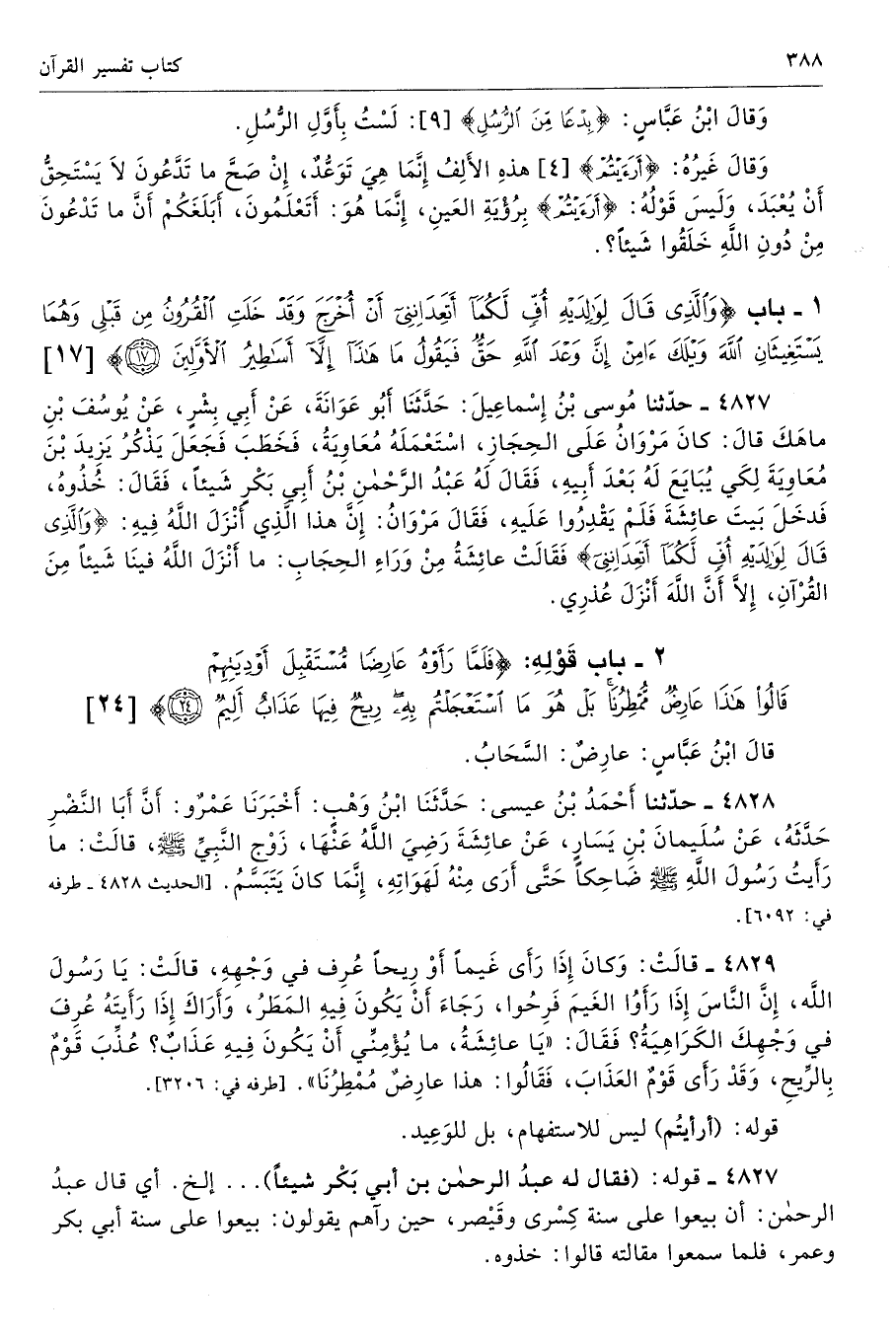 4827 - حَدَّثَنَا مُوسَى بْنُ إِسْمَاعِيلَ حَدَّثَنَا أَبُو عَوَانَةَ عَنْ أَبِى بِشْرٍ عَنْ يُوسُفَ بْنِ مَاهَكَ قَالَ كَانَ مَرْوَانُ عَلَى الْحِجَازِ اسْتَعْمَلَهُ مُعَاوِيَةُ، فَخَطَبَ فَجَعَلَ يَذْكُرُ يَزِيدَ بْنَ مُعَاوِيَةَ، لِكَىْ يُبَايِعَ لَهُ بَعْدَ أَبِيهِ، فَقَالَ لَهُ عَبْدُ الرَّحْمَنِ بْنُ أَبِى بَكْرٍ شَيْئًا، فَقَالَ خُذُوهُ. فَدَخَلَ بَيْتَ عَائِشَةَ فَلَمْ يَقْدِرُوا عَلَيْهِ فَقَالَ مَرْوَانُ إِنَّ هَذَا الَّذِى أَنْزَلَ اللَّهُ فِيهِ {وَالَّذِي قَالَ لِوَالِدَيْهِ أُفٍّ لَكُمَا أَتَعِدَانِنِي}. فَقَالَتْ عَائِشَةُ مِنْ وَرَاءِ الْحِجَابِ مَا أَنْزَلَ اللَّهُ فِينَا شَيْئًا مِنَ الْقُرْآنِ إِلاَّ أَنَّ اللَّهَ أَنْزَلَ عُذْرِى. تحفة 17692 - 167/ 6
