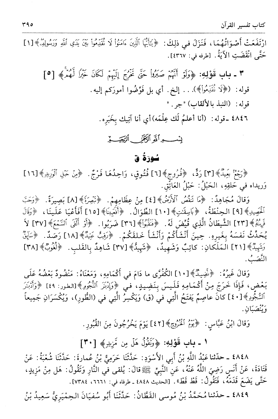 4848 - حَدَّثَنَا عَبْدُ اللَّهِ بْنُ أَبِى الأَسْوَدِ حَدَّثَنَا حَرَمِىٌّ حَدَّثَنَا شُعْبَةُ عَنْ قَتَادَةَ عَنْ أَنَسٍ - رضى الله عنه - عَنِ النَّبِىِّ - صلى الله عليه وسلم - قَالَ «يُلْقَى فِى النَّارِ وَتَقُولُ هَلْ مِنْ مَزِيدٍ. حَتَّى يَضَعَ قَدَمَهُ فَتَقُولُ قَطِ قَطِ». طرفاه 6661، 7384 - تحفة 1279