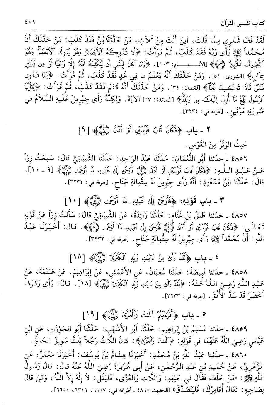 4856 - حَدَّثَنَا أَبُو النُّعْمَانِ حَدَّثَنَا عَبْدُ الْوَاحِدِ حَدَّثَنَا الشَّيْبَانِىُّ قَالَ سَمِعْتُ زِرًّا عَنْ عَبْدِ اللَّهِ {فَكَانَ قَابَ قَوْسَيْنِ أَوْ أَدْنَى (9) فَأَوْحَى إِلَى عَبْدِهِ مَا أَوْحَى (10)} [النجم: 9 - 10] قَالَ حَدَّثَنَا ابْنُ مَسْعُودٍ أَنَّهُ رَأَى جِبْرِيلَ لَهُ سِتُّمِائَةِ جَنَاحٍ. طرفاه 3232، 4857 - تحفة 9205