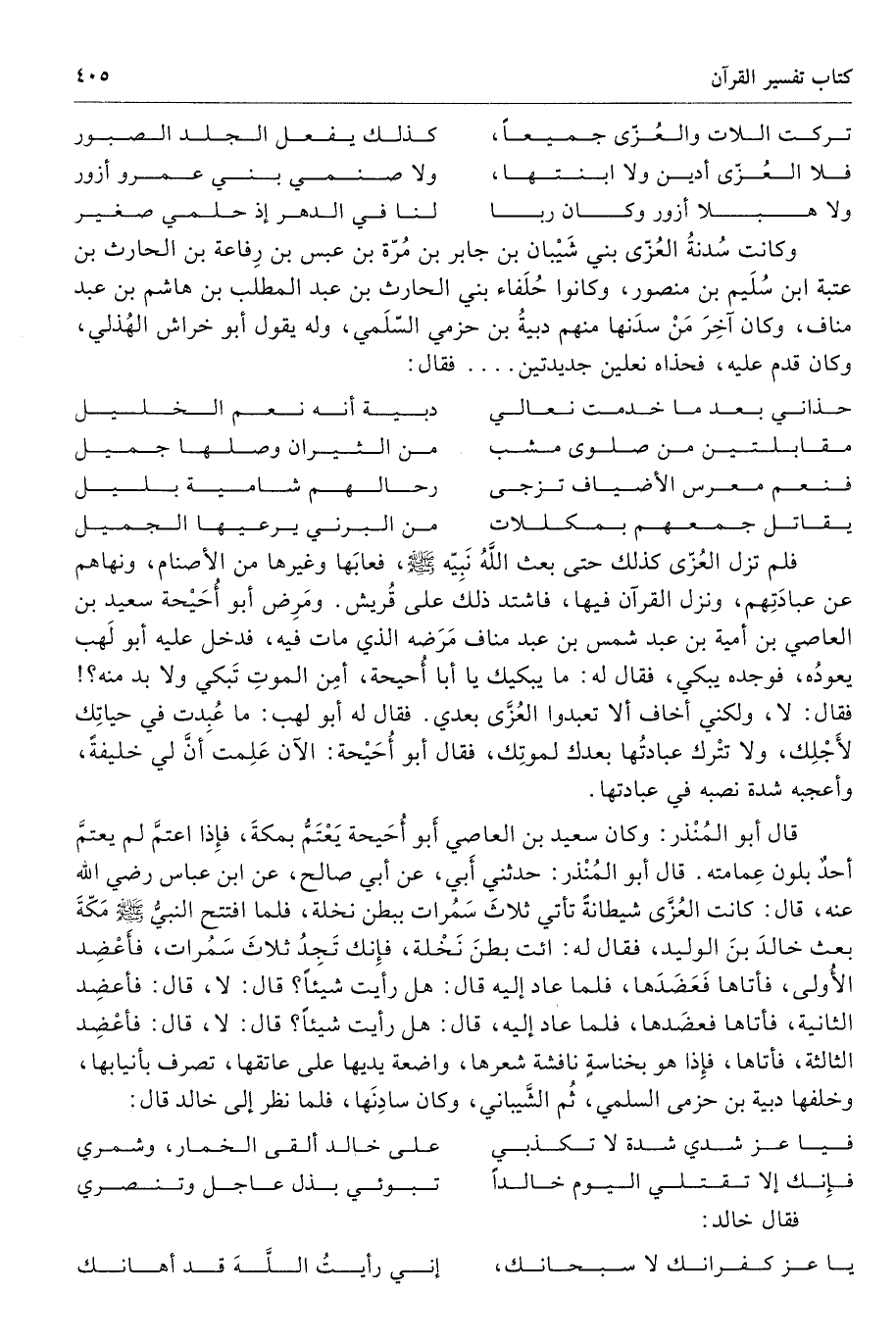 قال أبو المُنْذر: وكان سعيد بن العاصي أَبو أُحَيحة يَعْتَمُّ بمكةَ، فإِذا اعتمَّ لم يعتمَّ أحدٌ بلون عِمامته. قال أبو المُنْذر: حدثني أَبي، عن أبي صالح، عن ابن عباس رضي الله عنه، قال: كانت العُزَّى شيطانةً تأتي ثلاثَ سَمُرات ببطن نخلة، فلما افتتح النبيُّ صلى الله عليه وسلّم مَكّةَ بعث خالدَ بنَ الوليد، فقال له: إئت بطنَ نَخْلة، فإِنك تَجِدُ ثلاثَ سَمُرات، فأَعْضِد الأُولى، فأتاها فَعَضَدَها، فلما عاد إليه قال: هل رأيت شيئًا؟ قال: لا، قال: فأعضِد الثانية، فأتاها فعضَدها، فلما عاد إليه، قال: هل رأيت شيئًا؟ قال: لا، قال: فأعْضِد الثالثة، فأتاها، فإِذا هو بخناسةٍ نافشة شعرها، واضعة يديها على عاتِقِا، تصرف بأنيابها، وخلفها دبية بن حزمى السلمي، ثُم الشَّيباني، وكان سادِنَها، فلما نظر إلى خالد قال: