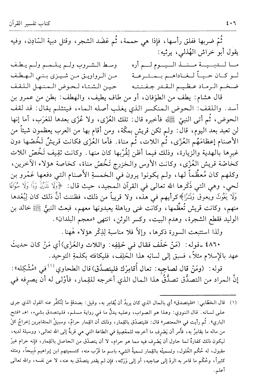 قال هشام: يطف من الطوَفان، أو من طاف يطيف، والهطف: بطن من عمرو بن أسد. واللقف: الحوض المنكسر الذي يغلب أصله الماء، فيتثلم يقال: قد لقف الحوض، ثُم أتى النبيّ صلى الله عليه وسلّم فأخبره قال: تلك العُزّى، ولا عُزّى بعدها للعَرَب، أما إنها لن تعبد بعد اليوم، قال: ولم تكن قريش بمكّة، ومن أقام بها من العرب يعظمون شيئًا من الأصنام إعظامَهُم العُزّى، ثُم اللاّت، ثُم مناة. فأما العُزّى فكانت قريشٌ تَخُصّها دون غيرِها بالهدية والزيارة، وذلك فيما أظن لِقُرْبها كان منها. وكانت ثِقِيف تَخُصّ اللاّت كخاصّة قريش العُزّى، وكانت الأوس والخزرج تَخُصّ مناة، كخاصة هؤلاء الآخرين، وكلهم كان مُعظِّمًا لها، ولم يكونوا يرون في الخمسةِ الأَصنام التي دفعها عَمْرو بن لحي، وهي التي ذَكَرها الله تعالى في القرآن المجيد، حيث قال: {وَقَالُوا لَا تَذَرُنَّ آلِهَتَكُمْ وَلَا تَذَرُنَّ وَدًّا وَلَا سُوَاعًا وَلَا يَغُوثَ وَيَعُوقَ وَنَسْرًا} كرأيهم في هذه، ولا قريبًا من ذلك، فظننت أنَّ ذلك كان لِبُعْدها منهم، وكانت قريش تُعظِّمها، وكانت غنى وباهلة يعبدونها معهم، فبعث النبيُّ صلى الله عليه وسلّم خالد بن الوليد فقطع الشجرة، وهدم البيت، وكسر الوثن، انتهى «معجم البلدان».