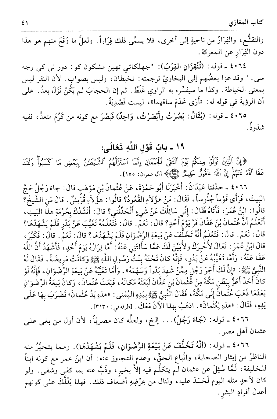 4066 - قوله: (أنَّهُ تَخَلَّفَ عَنْ بَيْعَةِ الرُضْوَانِ، فَلَمْ يَشْهَدْهَا) ومما يتحيَّرُ منه الناظرُ من إيثار الصحابة، واتَّباع الحقِّ، وعدم التجاوز عنه: أن ابنَ عمر مع كونه ابنًا للخليفة، لَمَّا سُئِلَ عن عثمان لم يتكلَّم فيه إلَّا بخيرٍ، وذَبَّ عنه بما كفى وشفى. ولو كان لأحدٍ مثله اليوم لَحَسَدَ عليه، ولنال من عِرْضِهِ أضعاف ذلك. فهذا يَدُلَّكَ على كونهم أعدلَ أفرادِ البشرِ.