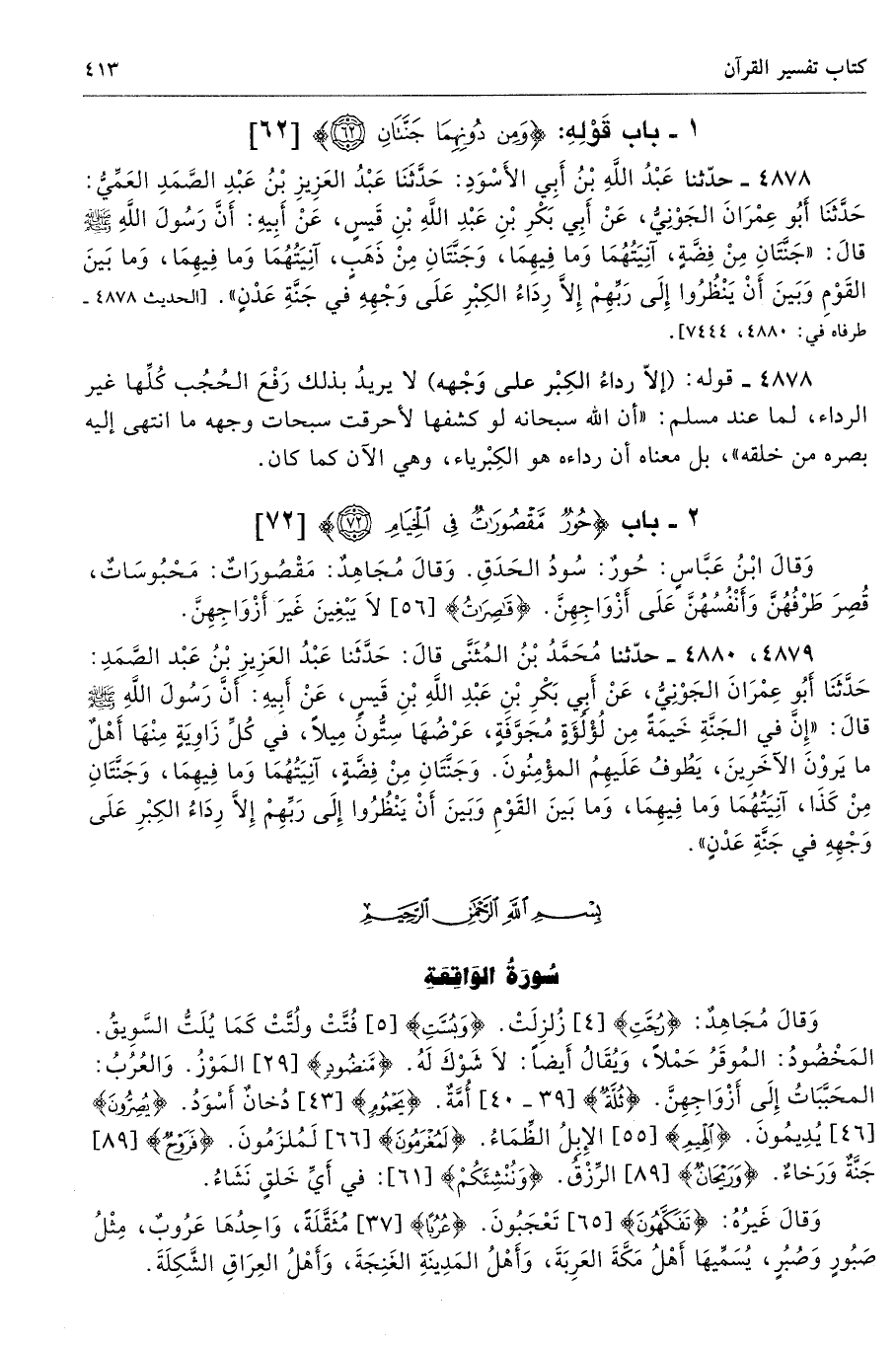 4879، 4880 - حَدَّثَنَا مُحَمَّدُ بْنُ الْمُثَنَّى قَالَ حَدَّثَنِى عَبْدُ الْعَزِيزِ بْنُ عَبْدِ الصَّمَدِ حَدَّثَنَا أَبُو عِمْرَانَ الْجَوْنِىُّ عَنْ أَبِى بَكْرِ بْنِ عَبْدِ اللَّهِ بْنِ قَيْسٍ عَنْ أَبِيهِ أَنَّ رَسُولَ اللَّهِ - صلى الله عليه وسلم - قَالَ «إِنَّ فِى الْجَنَّةِ خَيْمَةً مِنْ لُؤْلُؤَةٍ مُجَوَّفَةٍ، عَرْضُهَا سِتُّونَ مِيلاً، فِى كُلِّ زَاوِيَةٍ مِنْهَا أَهْلٌ، مَا يَرَوْنَ الآخَرِينَ يَطُوفُ عَلَيْهِمُ الْمُؤْمِنُونَ». «وَجَنَّتَانِ مِنْ فِضَّةٍ، آنِيَتُهُمَا وَمَا فِيهِمَا، وَجَنَّتَانِ مِنْ كَذَا آنِيَتُهُمَا، وَمَا فِيهِمَا، وَمَا بَيْنَ الْقَوْمِ وَبَيْنَ أَنْ يَنْظُرُوا إِلَى رَبِّهِمْ إِلاَّ رِدَاءُ الْكِبْرِ عَلَى وَجْهِهِ فِى جَنَّةِ عَدْنٍ». طرفاه 4878، 7444 تحفة 9135