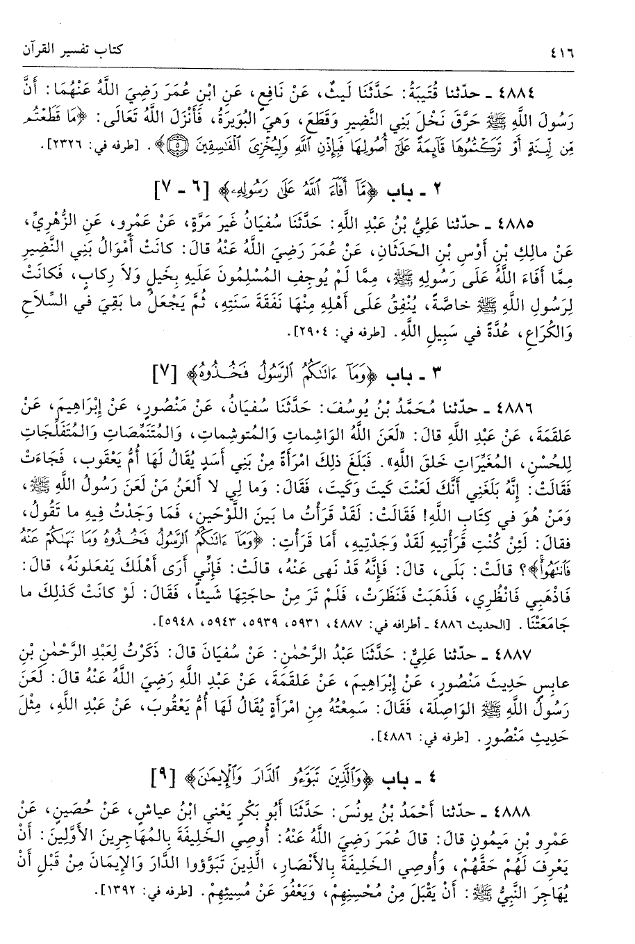 4884 - حَدَّثَنَا قُتَيْبَةُ حَدَّثَنَا لَيْثٌ عَنْ نَافِعٍ عَنِ ابْنِ عُمَرَ - رضى الله عنهما - أَنَّ رَسُولَ اللَّهِ - صلى الله عليه وسلم - حَرَّقَ نَخْلَ بَنِى النَّضِيرِ وَقَطَعَ، وَهْىَ الْبُوَيْرَةُ، فَأَنْزَلَ اللَّهُ تَعَالَى {مَا قَطَعْتُمْ مِنْ لِينَةٍ أَوْ تَرَكْتُمُوهَا قَائِمَةً عَلَى أُصُولِهَا فَبِإِذْنِ اللَّهِ وَلِيُخْزِيَ الْفَاسِقِينَ (5)}. أطرافه 2326، 3021، 4031، 4032 - تحفة 8267