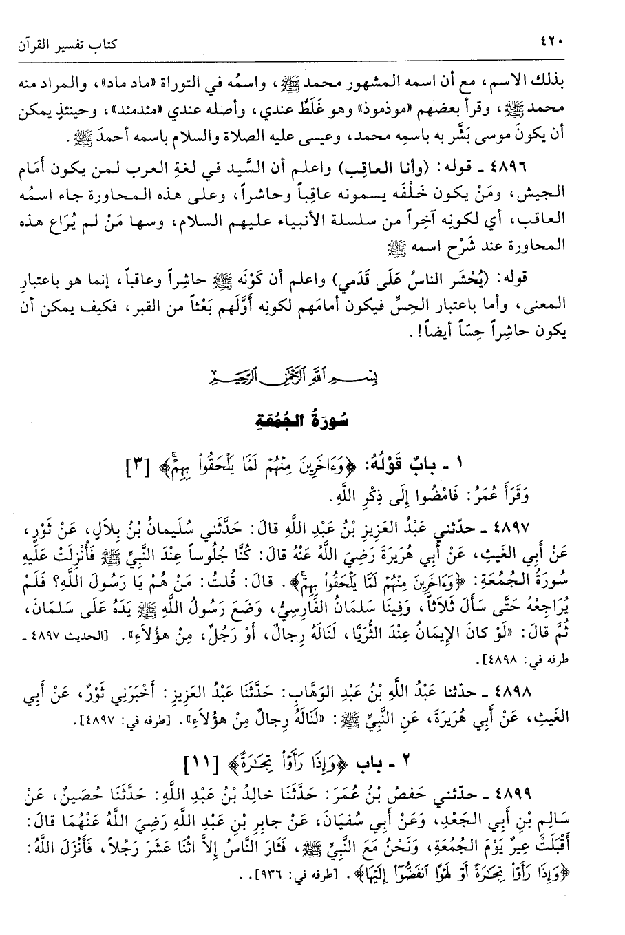 4897 - حَدَّثَنِى عَبْدُ الْعَزِيزِ بْنُ عَبْدِ اللَّهِ قَالَ حَدَّثَنِى سُلَيْمَانُ بْنُ بِلاَلٍ عَنْ ثَوْرٍ عَنْ أَبِى الْغَيْثِ عَنْ أَبِى هُرَيْرَةَ رضى الله عنه قَالَ كُنَّا جُلُوسًا عِنْدَ النَّبِىِّ - صلى الله عليه وسلم - فَأُنْزِلَتْ عَلَيْهِ سُورَةُ الْجُمُعَةِ {وَآخَرِينَ مِنْهُمْ لَمَّا يَلْحَقُوا بِهِمْ} قَالَ قُلْتُ مَنْ هُمْ يَا رَسُولَ اللَّهِ فَلَمْ يُرَاجِعْهُ حَتَّى سَأَلَ ثَلاَثًا، وَفِينَا سَلْمَانُ الْفَارِسِىُّ، وَضَعَ رَسُولُ اللَّهِ - صلى الله عليه وسلم - يَدَهُ عَلَى سَلْمَانَ ثُمَّ قَالَ «لَوْ كَانَ الإِيمَانُ عِنْدَ الثُّرَيَّا لَنَالَهُ رِجَالٌ - أَوْ رَجُلٌ - مِنْ هَؤُلاَءِ». طرفه 4898 - تحفة 12917 - 189/ 6