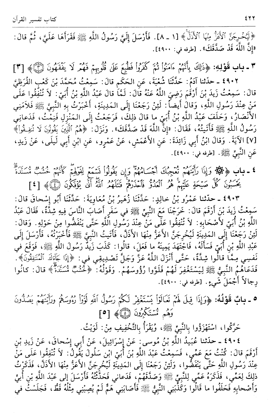 {لَيُخْرِجَنَّ الْأَعَزُّ مِنْهَا} [المنافقون: 1 - 8] فَأَرْسَلَ إِلَىَّ رَسُولُ اللَّهِ - صلى الله عليه وسلم - فَقَرَأَهَا عَلَىَّ ثُمَّ قَالَ «إِنَّ اللَّهَ قَدْ صَدَّقَكَ». أطرافه 4900، 4902، 4903، 4904 - تحفة 3678 - 190/ 6
