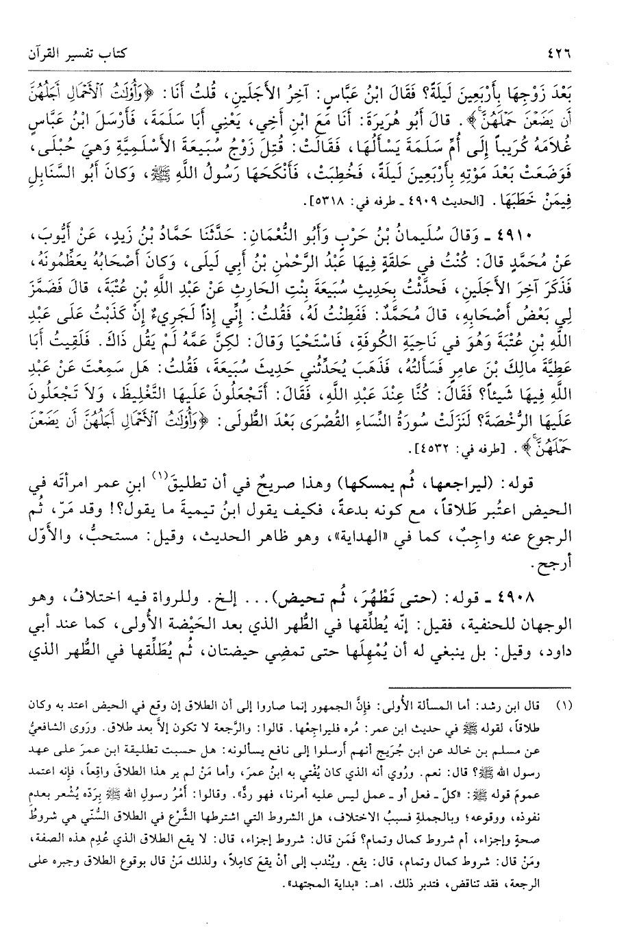 4910 - وَقَالَ سُلَيْمَانُ بْنُ حَرْبٍ وَأَبُو النُّعْمَانِ حَدَّثَنَا حَمَّادُ بْنُ زَيْدٍ عَنْ أَيُّوبَ عَنْ مُحَمَّدٍ قَالَ كُنْتُ فِى حَلْقَةٍ فِيهَا عَبْدُ الرَّحْمَنِ بْنُ أَبِى لَيْلَى وَكَانَ أَصْحَابُهُ يُعَظِّمُونَهُ، فَذَكَرَ آخِرَ الأَجَلَيْنِ فَحَدَّثْتُ بِحَدِيثِ سُبَيْعَةَ بِنْتِ الْحَارِثِ عَنْ عَبْدِ اللَّهِ بْنِ عُتْبَةَ قَالَ فَضَمَّزَ لِى بَعْضُ أَصْحَابِهِ. قَالَ مُحَمَّدٌ فَفَطِنْتُ لَهُ فَقُلْتُ إِنِّى إِذًا لَجَرِىءٌ إِنْ كَذَبْتُ عَلَى عَبْدِ اللَّهِ بْنِ عُتْبَةَ وَهْوَ فِى نَاحِيَةِ الْكُوفَةِ. فَاسْتَحْيَا وَقَالَ لَكِنَّ عَمَّهُ لَمْ يَقُلْ ذَاكَ. فَلَقِيتُ أَبَا عَطِيَّةَ مَالِكَ بْنَ عَامِرٍ فَسَأَلْتُهُ فَذَهَبَ يُحَدِّثُنِى حَدِيثَ سُبَيْعَةَ فَقُلْتُ هَلْ سَمِعْتَ عَنْ عَبْدِ اللَّهِ فِيهَا شَيْئًا فَقَالَ كُنَّا عِنْدَ عَبْدِ اللَّهِ فَقَالَ أَتَجْعَلُونَ عَلَيْهَا التَّغْلِيظَ وَلاَ تَجْعَلُونَ عَلَيْهَا الرُّخْصَةَ. لَنَزَلَتْ سُورَةُ النِّسَاءِ الْقُصْرَى بَعْدَ الطُّولَى {وَأُولَاتُ الْأَحْمَالِ أَجَلُهُنَّ أَنْ يَضَعْنَ حَمْلَهُنَّ}. طرفه 4532 - تحفة 9544، 15890 ل