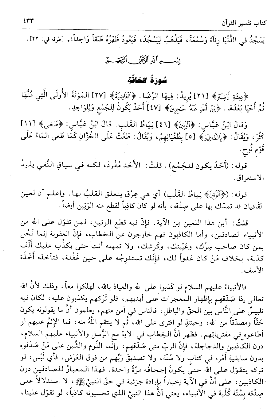 وَقالَ ابْنُ عَبَّاسٍ: {الْوَتِينَ} [46] نِيَاطُ القَلبِ. قالَ ابْنُ عَبَّاسٍ: {طَغى} [11] كَثُرَ، وَيُقَالُ: {بِالطَّاغِيَةِ} [5] بِطُغْيَانِهِمْ، وَيُقَالُ: طَغَتْ عَلَى الخُزَّانِ كَمَا طَغى المَاءُ عَلَى قَوْمِ نُوحٍ.