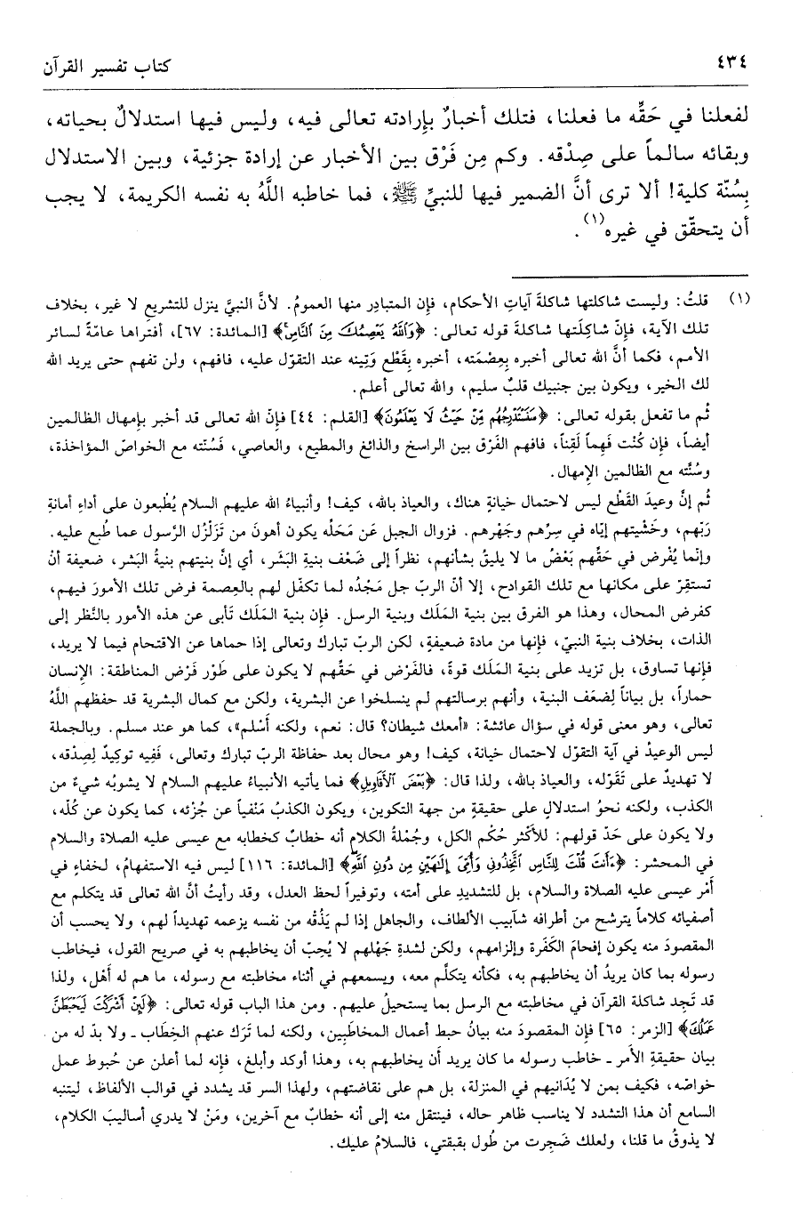 لفعلنا في حَقِّه ما فعلنا، فتلك أخبارٌ بإِرادته تعالى فيه، وليس فيها استدلالٌ بحياته، وبقائه سالمًا على صِدْقه. وكم مِن فَرْق بين الأخبار عن إرادة جزئية، وبين الاستدلال بِسُنّة كلية ألا ترى أنَّ الضمير فيها للنبيِّ صلى الله عليه وسلّم فما خاطبه اللهُ به نفسه الكريمة، لا يجب أن يتحقّق في غيره (¬1).