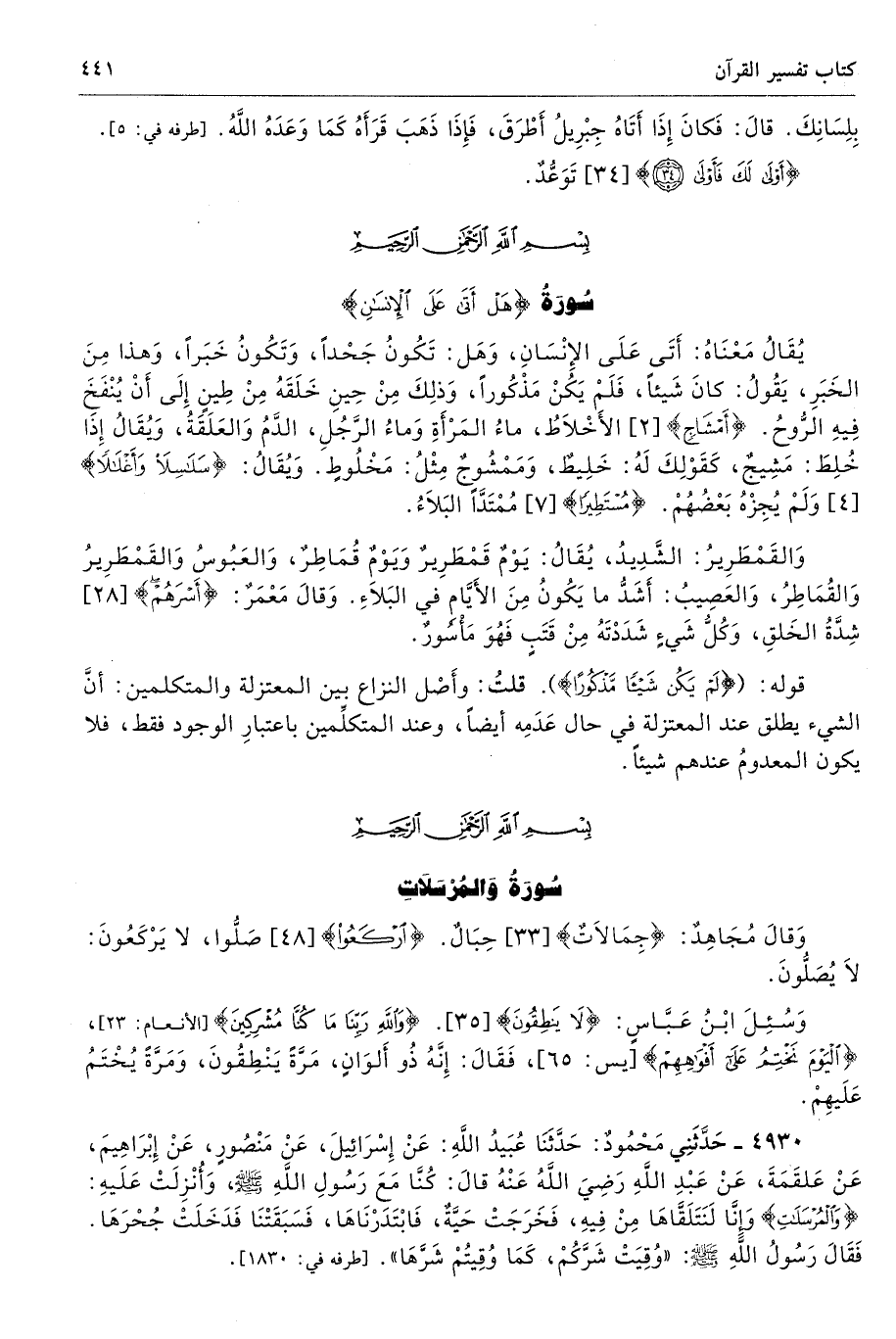 يُقَالُ مَعْنَاهُ: أَتَى عَلَى الإِنْسَانِ، وَهَل: تَكُونُ جَحْدًا، وَتَكُونُ خَبَرًا، وَهذا مِنَ الخَبَرِ، يَقُولُ: كانَ شَيئًا، فَلَمْ يَكُنْ مَذْكُورًا، وَذلِكَ مِنْ حِينِ خَلَقَهُ مِنْ طِينٍ إِلَى أَنْ يُنْفَخَ فِيهِ الرُّوحُ. {أَمْشَاجٍ} [2] الأَخْلاَطُ، ماءُ المَرْأَةِ وَماءُ الرَّجُلِ، الدَّمُ وَالعَلَقَةُ، وَيُقَالُ إِذَا خُلِطَ: مَشِيجٌ، كَقَوْلِكَ لَهُ: خَلِيطٌ، وَمَمْشُوجٌ مِثْلُ: مَخْلُوطٍ. وَيُقَالُ: {سَلَاسِلَ وَأَغْلَالًا} [4] وَلَمْ يُجْرِهِ بَعْضُهُمْ. {مُسْتَطِيرًا} [7] مُمْتَدًّا البَلاَءُ.