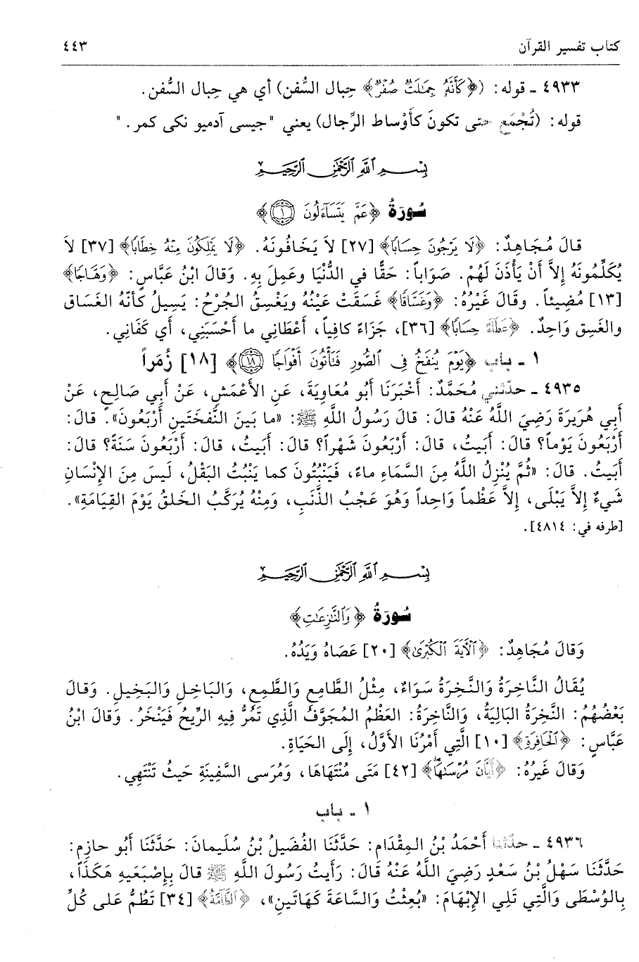 4935 - حَدَّثَنِى مُحَمَّدٌ أَخْبَرَنَا أَبُو مُعَاوِيَةَ عَنِ الأَعْمَشِ عَنْ أَبِى صَالِحٍ عَنْ أَبِى هُرَيْرَةَ - رضى الله عنه - قَالَ قَالَ رَسُولُ اللَّهِ - صلى الله عليه وسلم - «مَا بَيْنَ النَّفْخَتَيْنِ أَرْبَعُونَ». قَالَ أَرْبَعُونَ يَوْمًا قَالَ أَبَيْتُ. قَالَ أَرْبَعُونَ شَهْرًا قَالَ أَبَيْتُ. قَالَ أَرْبَعُونَ سَنَةً قَالَ أَبَيْتُ. قَالَ «ثُمَّ يُنْزِلُ اللَّهُ مِنَ السَّمَاءِ مَاءً. فَيَنْبُتُونَ كَمَا يَنْبُتُ الْبَقْلُ لَيْسَ مِنَ الإِنْسَانِ شَىْءٌ إِلاَّ يَبْلَى إِلاَّ عَظْمًا وَاحِدًا وَهْوَ عَجْبُ الذَّنَبِ، وَمِنْهُ يُرَكَّبُ الْخَلْقُ يَوْمَ الْقِيَامَةِ». طرفه 4814 - تحفة 12508 - 206/ 6