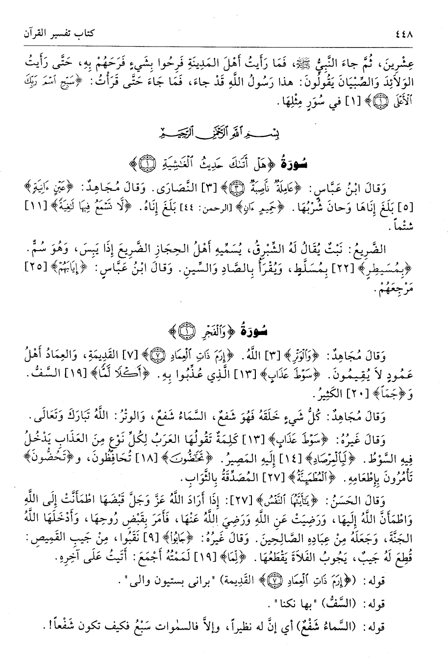 وَقالَ غَيرُهُ: {سَوْطَ عَذَابٍ} [13] كَلِمَةٌ تَقُولُهَا العَرَبُ لِكُلِّ نَوْعٍ مِنَ العَذَابِ يَدْخُلُ فِيهِ السَّوْطُ. {لَبِالْمِرْصَادِ} [14] إِلَيهِ المَصِيرُ. {تَحَاضُّونَ} [18] تُحَافِظُونَ، و {تَحُضُّونَ} تَأْمُرُونَ بِإِطْعَامِهِ. {الْمُطْمَئِنَّةُ} [27] المُصَدِّقَةُ بِالثَّوَابِ.