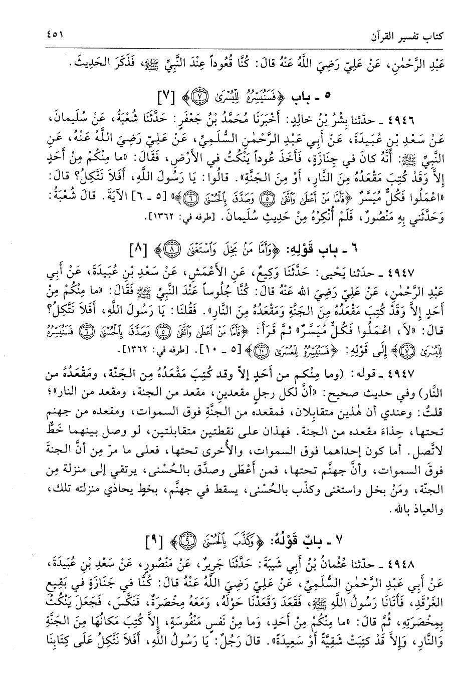 4947 - حَدَّثَنَا يَحْيَى حَدَّثَنَا وَكِيعٌ عَنِ الأَعْمَشِ عَنْ سَعْدِ بْنِ عُبَيْدَةَ عَنْ أَبِى عَبْدِ الرَّحْمَنِ عَنْ عَلِىٍّ - عَلَيْهِ السَّلاَمُ - قَالَ كُنَّا جُلُوسًا عِنْدَ النَّبِىِّ - صلى الله عليه وسلم - فَقَالَ «مَا مِنْكُمْ مِنْ أَحَدٍ إِلاَّ وَقَدْ كُتِبَ مَقْعَدُهُ مِنَ الْجَنَّةِ وَمَقْعَدُهُ مِنَ النَّارِ». فَقُلْنَا يَا رَسُولَ اللَّهِ أَفَلاَ نَتَّكِلُ قَالَ «لاَ، اعْمَلُوا فَكُلٌّ مُيَسَّرٌ». ثُمَّ قَرَأَ {فَأَمَّا مَنْ أَعْطَى وَاتَّقَى (5) وَصَدَّقَ بِالْحُسْنَى (6) فَسَنُيَسِّرُهُ لِلْيُسْرَى (7)} إِلَى قَوْلِهِ {فَسَنُيَسِّرُهُ لِلْعُسْرَى (10)} [الليل: 5 - 10]. أطرافه 1362، 4945، 4946، 4948، 4949، 6217، 6605، 7552 تحفة 10167 - 212/ 6
