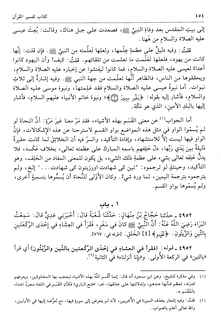 4952 - قوله: (فقرأ في العشاءِ في إحْدَى الرَّكْعتين بالتِّين والزَّيْتُون) أي قرأ «بالتين» في الركعة الأُولى. و «بإِنا أنزلناه» في الثانية (¬2).