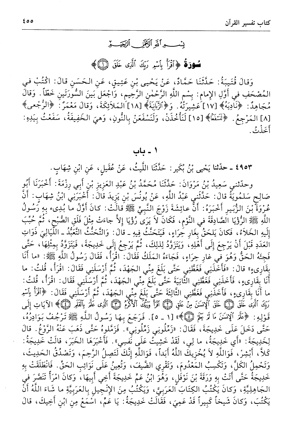 وَقالَ قُتَيبَةُ: حَدَّثَنَا حَمَّادٌ، عَنْ يَحْيىبْنِ عَتِيقٍ، عَنِ الحَسَنِ قالَ: اكْتُبْ في المُصْحَفِ في أَوَّلِ الإِمامِ: بِسْمِ اللَّهِ الرَّحْمنِ الرَّحِيمِ، وَاجْعَل بَينَ السُّورَتَينِ خَطًّا. وَقالَ مُجَاهِدٌ: {نَادِيَهُ} [17] عَشِيرَتَهُ. وَ {الزَّبَانِيَةَ} [18] المَلاَئِكَةَ، وَقالَ مَعْمَرٌ: {الرُّجْعى} [8] المَرْجِعُ. {لَنَسْفَعًا} [15] لَنَأْخُذَنْ، وَلَنَسْفَعَنْ بِالنُّونِ، وَهيَ الخَفِيفَةُ، سَفَعْتُ بِيَدِهِ: أَخَذْتُ.