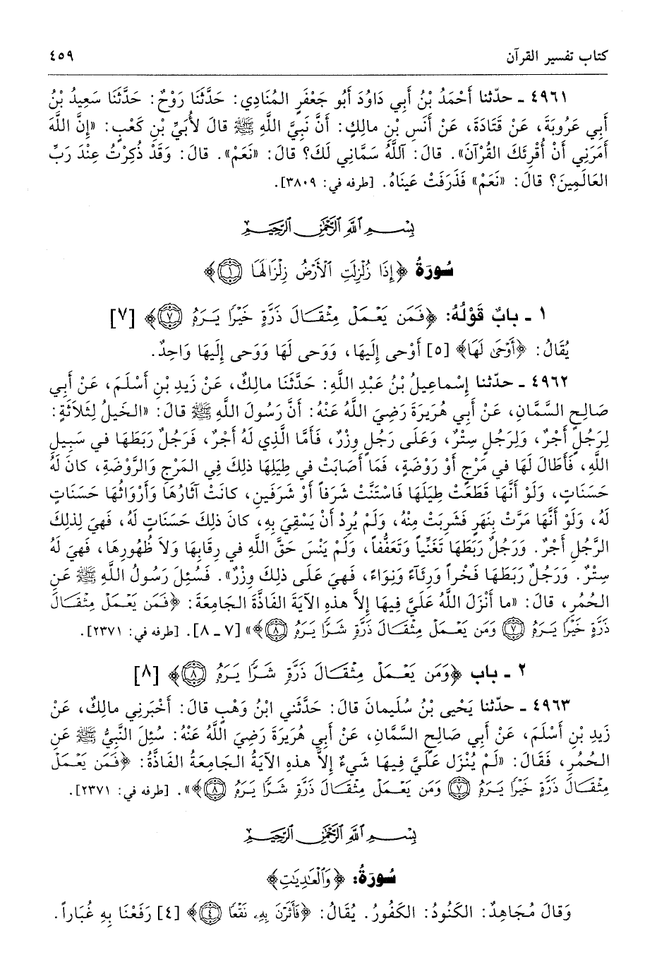 1 - باب قَوْلِهِ: {فَمَنْ يَعْمَلْ مِثْقَالَ ذَرَّةٍ خَيْرًا يَرَهُ (7)} [الزلزلة: 7]