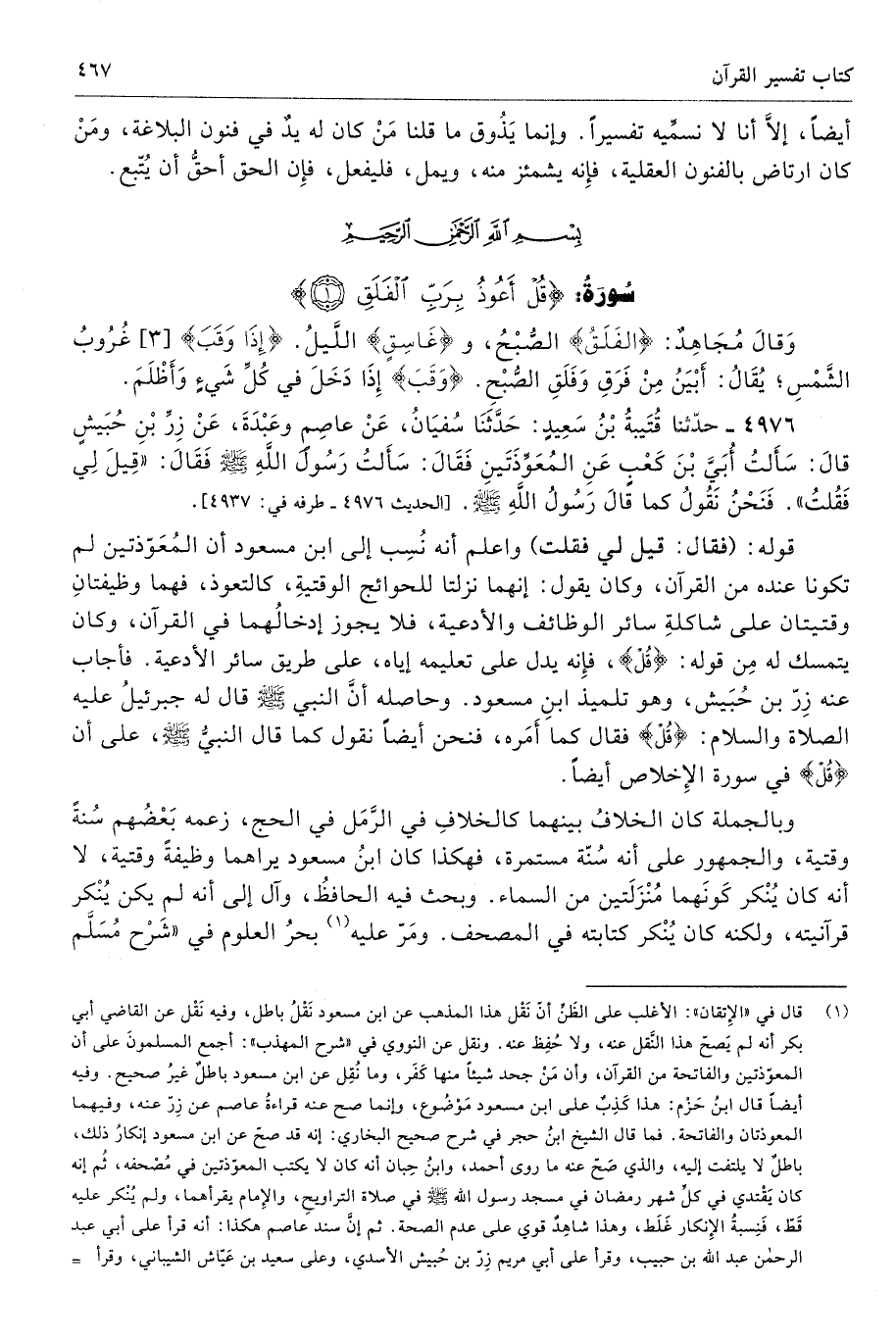 (¬1) قال في "الإِتقان": الأغلب على الظَنِّ أنّ نَقْل هذا المذهب عن ابن مسعود نَقْلُ باطل، وفيه نَقْل عن القاضي أبي بكر أنه لم يَصحّ هذا النَّقل عنه، ولا حُفِظ عنه. ونقل عن النووي في "شرح المهذب": أجمع المسلمونَ على أن المعوّذتين والفاتحة من القرآن، وأن مَنْ جحد شيئًا منها كَفَر، وما نُقِل عن ابن مسعود باطلٌ غيرُ صحيح. وفيه أيضًا قال ابنُ حَزْم: هذا كَذِب على ابن مسعود مَوْضُوع، وإنما صح عنه قراءةُ عاصم عن زِرّ عنه، وفيهما المعوذتان والفاتحة. فما قال الشيخ ابنُ حجر في شرح صحيح البخاري: إنه قد صحّ عن ابن مسعود إنكارُ ذلك، باطلٌ لا يلتفت إليه، والذي صَحّ عنه ما روى أحمد، وابنُ حِبان أنه كان لا يكتب المعوّذتين في مُصْحفه، ثُم إنه كان يَقْتدي في كل شهر رمضان في مسجد رسول الله - صلى الله عليه وسلم - في صلاة التراويحِ، والإِمام يقرأهما، ولم يُنْكر عليه قَطّ، فَنِسبةُ الإِنكار غَلَط، وهذا شاهِدٌ قوي على عدم الصحة. ثم إنَّ سند عاصم هكذا: أنه قرأ على أبي عبد الرحمن عبد الله بن حبيب، وقرأ على أبي مريم زِرّ بن حُبيش الأسدي، وعلى سعيد بن عَيّاش الشيباني، وقرأ =