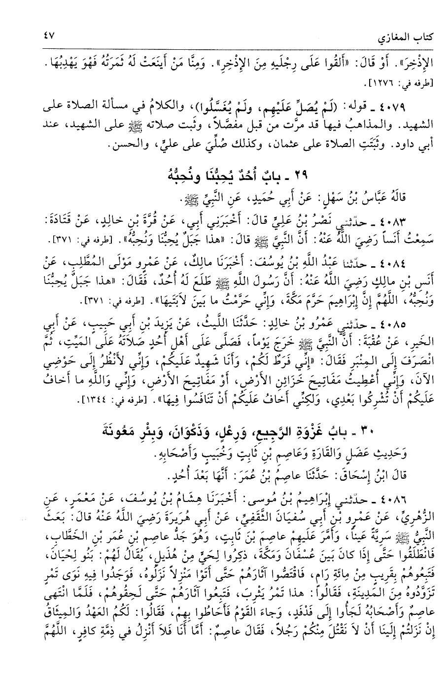 4083 - حَدَّثَنِى نَصْرُ بْنُ عَلِىٍّ قَالَ أَخْبَرَنِى أَبِى عَنْ قُرَّةَ بْنِ خَالِدٍ عَنْ قَتَادَةَ سَمِعْتُ أَنَسًا - رضى الله عنه - أَنَّ النَّبِىَّ - صلى الله عليه وسلم - قَالَ «هَذَا جَبَلٌ يُحِبُّنَا وَنُحِبُّهُ». أطرافه 371، 610، 947، 2228، 2235، 2889، 2893، 2943، 2944، 2945، 2991، 3085، 3086، 3367، 3647، 4084، 4197، 4198، 4199، 4200، 4201، 4211، 4212، 4213، 5085، 5159، 5169، 5387، 5425، 5528، 5968، 6185، 6363، 6369، 7333 - تحفة 1325