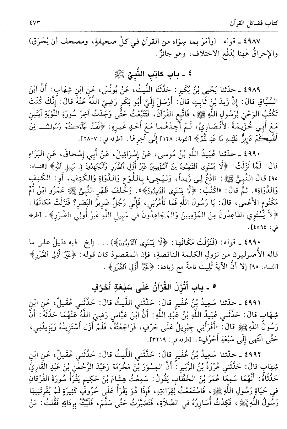 4991 - حَدَّثَنَا سَعِيدُ بْنُ عُفَيْرٍ قَالَ حَدَّثَنِى اللَّيْثُ قَالَ حَدَّثَنِى عُقَيْلٌ عَنِ ابْنِ شِهَابٍ قَالَ حَدَّثَنِى عُبَيْدُ اللَّهِ بْنُ عَبْدِ اللَّهِ أَنَّ ابْنَ عَبَّاسٍ - رضى الله عنهما - حَدَّثَهُ أَنَّ رَسُولَ اللَّهِ - صلى الله عليه وسلم - قَالَ «أَقْرَأَنِى جِبْرِيلُ عَلَى حَرْفٍ فَرَاجَعْتُهُ، فَلَمْ أَزَلْ أَسْتَزِيدُهُ وَيَزِيدُنِى حَتَّى انْتَهَى إِلَى سَبْعَةِ أَحْرُفٍ». طرفه 3219 - تحفة 5844