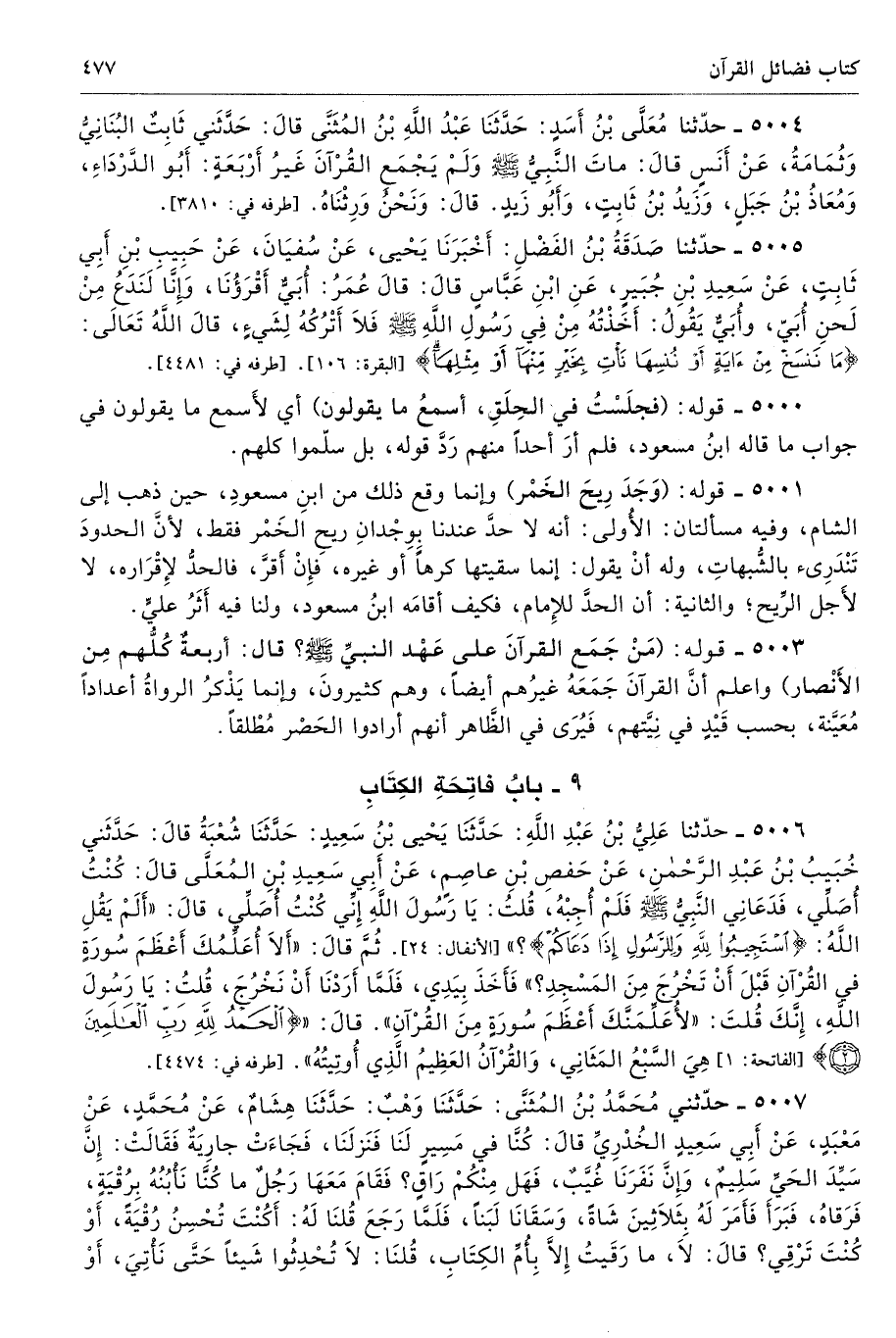 5006 - حَدَّثَنَا عَلِىُّ بْنُ عَبْدِ اللَّهِ حَدَّثَنَا يَحْيَى بْنُ سَعِيدٍ حَدَّثَنَا شُعْبَةُ قَالَ حَدَّثَنِى خُبَيْبُ بْنُ عَبْدِ الرَّحْمَنِ عَنْ حَفْصِ بْنِ عَاصِمٍ عَنْ أَبِى سَعِيدِ بْنِ الْمُعَلَّى قَالَ كُنْتُ أُصَلِّى فَدَعَانِى النَّبِىُّ - صلى الله عليه وسلم - فَلَمْ أُجِبْهُ قُلْتُ يَا رَسُولَ اللَّهِ إِنِّى كُنْتُ أُصَلِّى. قَالَ «أَلَمْ يَقُلِ اللَّهُ {اسْتَجِيبُوا لِلَّهِ وَلِلرَّسُولِ إِذَا دَعَاكُمْ} [الأنفال: 24] ثُمَّ قَالَ أَلاَ أُعَلِّمُكَ أَعْظَمَ سُورَةٍ فِى الْقُرْآنِ قَبْلَ أَنْ تَخْرُجَ مِنَ الْمَسْجِدِ». فَأَخَذَ بِيَدِى فَلَمَّا أَرَدْنَا أَنْ نَخْرُجَ قُلْتُ يَا رَسُولَ اللَّهِ إِنَّكَ قُلْتَ لأُعَلِّمَنَّكَ أَعْظَمَ سُورَةٍ مِنَ الْقُرْآنِ. قَالَ {الْحَمْدُ لِلَّهِ رَبِّ الْعَالَمِينَ (2)} [الفاتحة: 2] هِىَ السَّبْعُ الْمَثَانِى وَالْقُرْآنُ الْعَظِيمُ الَّذِى أُوتِيتُهُ». أطرافه 4474، 4647، 4703 تحفة 12047 - 231/ 6