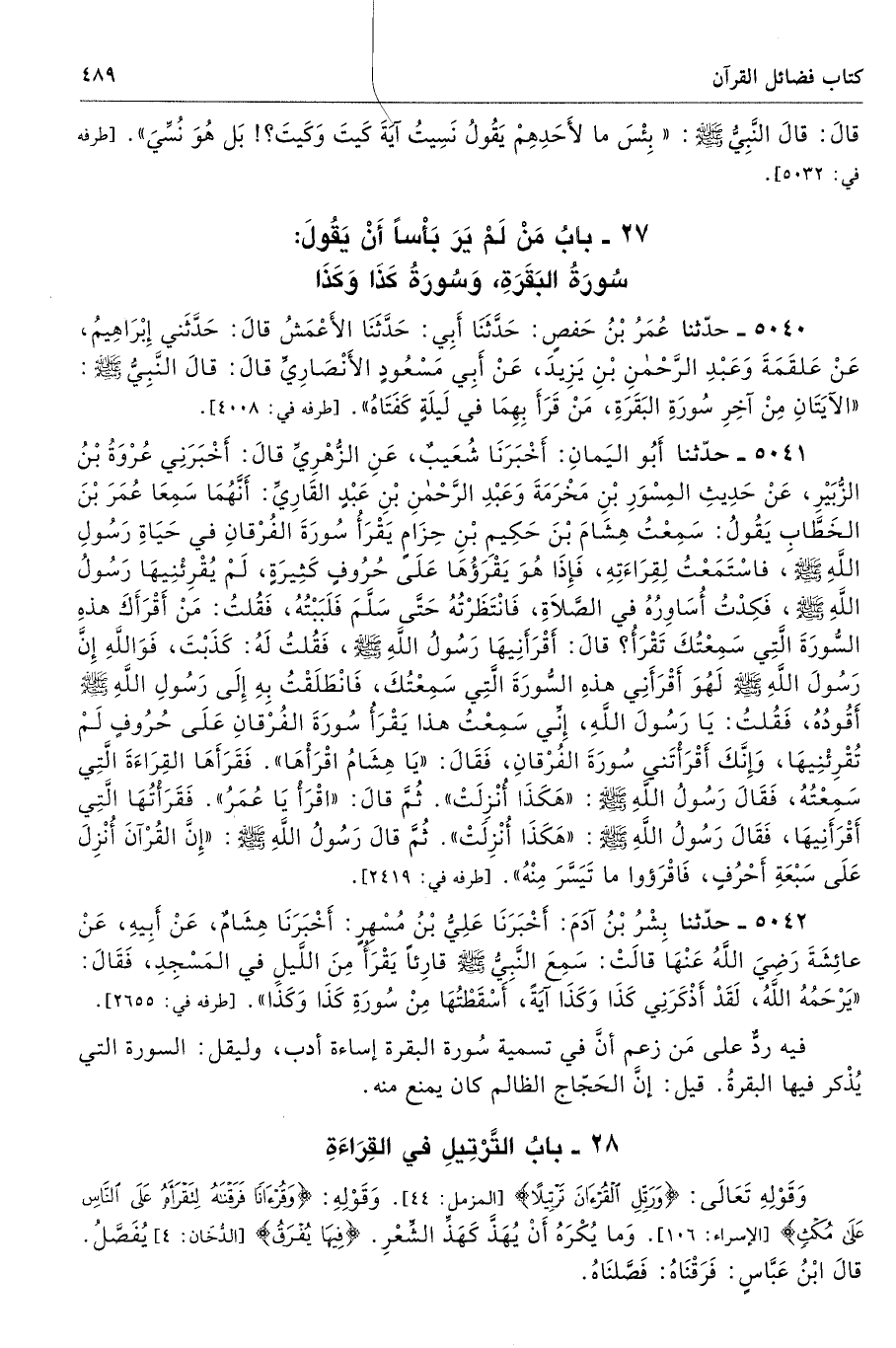 27 - باب مَنْ لَمْ يَرَ بَأْسًا أَنْ يَقُولَ: سُورَةُ الْبَقَرَةِ، وَسُورَةُ كَذَا وَكَذَا