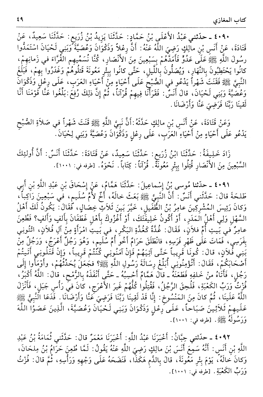 4091 - حَدَّثَنَا مُوسَى بْنُ إِسْمَاعِيلَ حَدَّثَنَا هَمَّامٌ عَنْ إِسْحَاقَ بْنِ عَبْدِ اللَّهِ بْنِ أَبِى طَلْحَةَ قَالَ حَدَّثَنِى أَنَسٌ أَنَّ النَّبِىَّ - صلى الله عليه وسلم - بَعَثَ خَالَهُ أَخٌ لأُمِّ سُلَيْمٍ فِى سَبْعِينَ رَاكِبًا، وَكَانَ رَئِيسَ الْمُشْرِكِينَ عَامِرُ بْنُ الطُّفَيْلِ خَيَّرَ بَيْنَ ثَلاَثِ خِصَالٍ فَقَالَ يَكُونُ لَكَ أَهْلُ السَّهْلِ، وَلِى أَهْلُ الْمَدَرِ، أَوْ أَكُونُ خَلِيفَتَكَ، أَوْ أَغْزُوكَ بِأَهْلِ غَطَفَانَ بِأَلْفٍ وَأَلْفٍ، فَطُعِنَ عَامِرٌ فِى بَيْتِ أُمِّ فُلاَنٍ فَقَالَ غُدَّةٌ كَغُدَّةِ الْبَكْرِ فِى بَيْتِ امْرَأَةٍ مِنْ آلِ فُلاَنٍ ائْتُونِى بِفَرَسِى. فَمَاتَ عَلَى ظَهْرِ فَرَسِهِ، فَانْطَلَقَ حَرَامٌ أَخُو أُمِّ سُلَيْمٍ هُوَ {وَ} رَجُلٌ أَعْرَجُ وَرَجُلٌ مِنْ بَنِى فُلاَنٍ قَالَ كُونَا قَرِيبًا حَتَّى آتِيَهُمْ، فَإِنْ آمَنُونِى كُنْتُمْ، وَإِنْ قَتَلُونِى أَتَيْتُمْ أَصْحَابَكُمْ. فَقَالَ أَتُؤْمِنُونِى أُبَلِّغْ رِسَالَةَ رَسُولِ اللَّهِ - صلى الله عليه وسلم -. فَجَعَلَ يُحَدِّثُهُمْ وَأَوْمَئُوا إِلَى رَجُلٍ، فَأَتَاهُ مِنْ خَلْفِهِ فَطَعَنَهُ - قَالَ هَمَّامٌ أَحْسِبُهُ حَتَّى أَنْفَذَهُ - بِالرُّمْحِ، قَالَ اللَّهُ أَكْبَرُ فُزْتُ وَرَبِّ الْكَعْبَةِ. فَلُحِقَ الرَّجُلُ، فَقُتِلُوا كُلُّهُمْ غَيْرَ الأَعْرَجِ كَانَ فِى رَأْسِ جَبَلٍ، فَأَنْزَلَ اللَّهُ عَلَيْنَا، ثُمَّ كَانَ مِنَ الْمَنْسُوخِ إِنَّا قَدْ لَقِينَا رَبَّنَا فَرَضِىَ عَنَّا وَأَرْضَانَا. فَدَعَا النَّبِىُّ - صلى الله عليه وسلم - عَلَيْهِمْ ثَلاَثِينَ صَبَاحًا، عَلَى رِعْلٍ وَذَكْوَانَ وَبَنِى لَحْيَانَ وَعُصَيَّةَ، الَّذِينَ عَصَوُا اللَّهَ وَرَسُولَهُ - صلى الله عليه وسلم -. أطرافه 1001، 1002، 1003، 1300، 2801، 2814، 3064، 3170، 4088، 4089، 4090، 4092، 4094، 4095، 4096، 6394، 7341 - تحفة 217 - 135/ 5