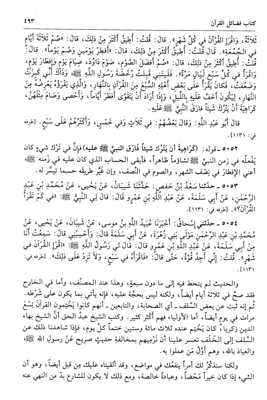 5054 - حَدَّثَنِى إِسْحَاقُ أَخْبَرَنَا عُبَيْدُ اللَّهِ عَنْ شَيْبَانَ عَنْ يَحْيَى عَنْ مُحَمَّدِ بْنِ عَبْدِ الرَّحْمَنِ مَوْلَى بَنِى زُهْرَةَ عَنْ أَبِى سَلَمَةَ - قَالَ وَأَحْسِبُنِى قَالَ - سَمِعْتُ أَنَا مِنْ أَبِى سَلَمَةَ عَنْ عَبْدِ اللَّهِ بْنِ عَمْرٍو قَالَ قَالَ رَسُولُ اللَّهِ - صلى الله عليه وسلم - «اقْرَإِ الْقُرْآنَ فِى شَهْرٍ». قُلْتُ إِنِّى أَجِدُ قُوَّةً حَتَّى قَالَ «فَاقْرَأْهُ فِى سَبْعٍ وَلاَ تَزِدْ عَلَى ذَلِكَ». أطرافه 1131، 1152، 1153، 1974، 1975، 1976، 1977، 1978، 1979، 1980، 3418، 3419، 3420، 5052، 5053، 5199، 6134، 6277 تحفة 8962