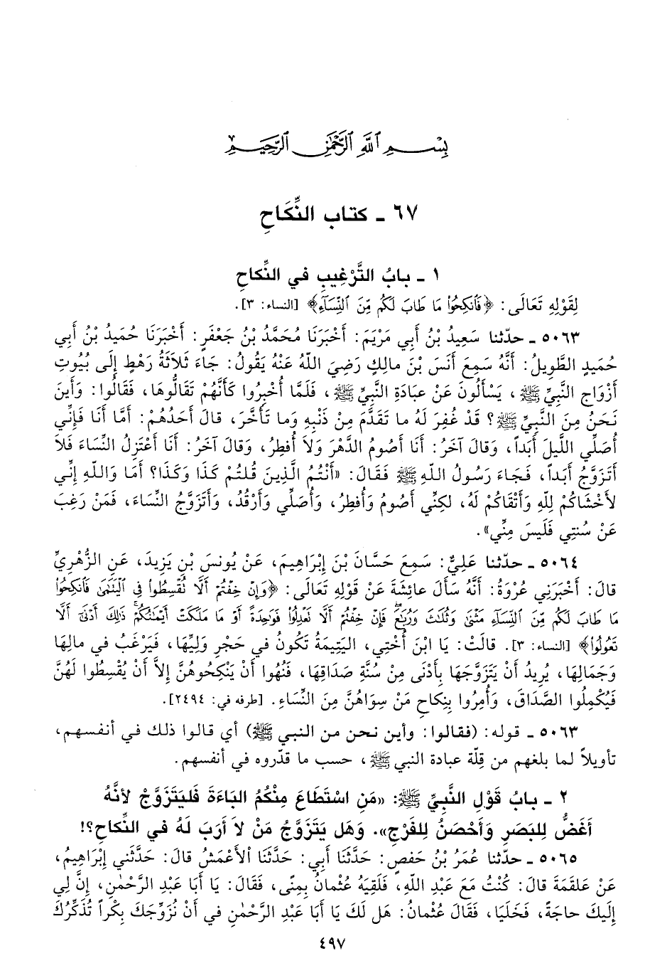 5063 - حَدَّثَنَا سَعِيدُ بْنُ أَبِى مَرْيَمَ أَخْبَرَنَا مُحَمَّدُ بْنُ جَعْفَرٍ أَخْبَرَنَا حُمَيْدُ بْنُ أَبِى حُمَيْدٍ الطَّوِيلُ أَنَّهُ سَمِعَ أَنَسَ بْنَ مَالِكٍ - رضى الله عنه - يَقُولُ جَاءَ ثَلاَثَةُ رَهْطٍ إِلَى بُيُوتِ أَزْوَاجِ النَّبِىِّ - صلى الله عليه وسلم - يَسْأَلُونَ عَنْ عِبَادَةِ النَّبِىِّ - صلى الله عليه وسلم - فَلَمَّا أُخْبِرُوا كَأَنَّهُمْ تَقَالُّوهَا فَقَالُوا وَأَيْنَ نَحْنُ مِنَ النَّبِىِّ - صلى الله عليه وسلم - قَدْ غُفِرَ لَهُ مَا تَقَدَّمَ مِنْ ذَنْبِهِ وَمَا تَأَخَّرَ. قَالَ أَحَدُهُمْ أَمَّا أَنَا فَإِنِّى أُصَلِّى اللَّيْلَ أَبَدًا. وَقَالَ آخَرُ أَنَا أَصُومُ الدَّهْرَ وَلاَ أُفْطِرُ. وَقَالَ آخَرُ أَنَا أَعْتَزِلُ النِّسَاءَ فَلاَ أَتَزَوَّجُ أَبَدًا. فَجَاءَ رَسُولُ اللَّهِ - صلى الله عليه وسلم - فَقَالَ «أَنْتُمُ الَّذِينَ قُلْتُمْ كَذَا وَكَذَا أَمَا وَاللَّهِ إِنِّى لأَخْشَاكُمْ لِلَّهِ وَأَتْقَاكُمْ لَهُ، لَكِنِّى أَصُومُ وَأُفْطِرُ، وَأُصَلِّى وَأَرْقُدُ وَأَتَزَوَّجُ النِّسَاءَ، فَمَنْ رَغِبَ عَنْ سُنَّتِى فَلَيْسَ مِنِّى». تحفة 745 - 2/ 7