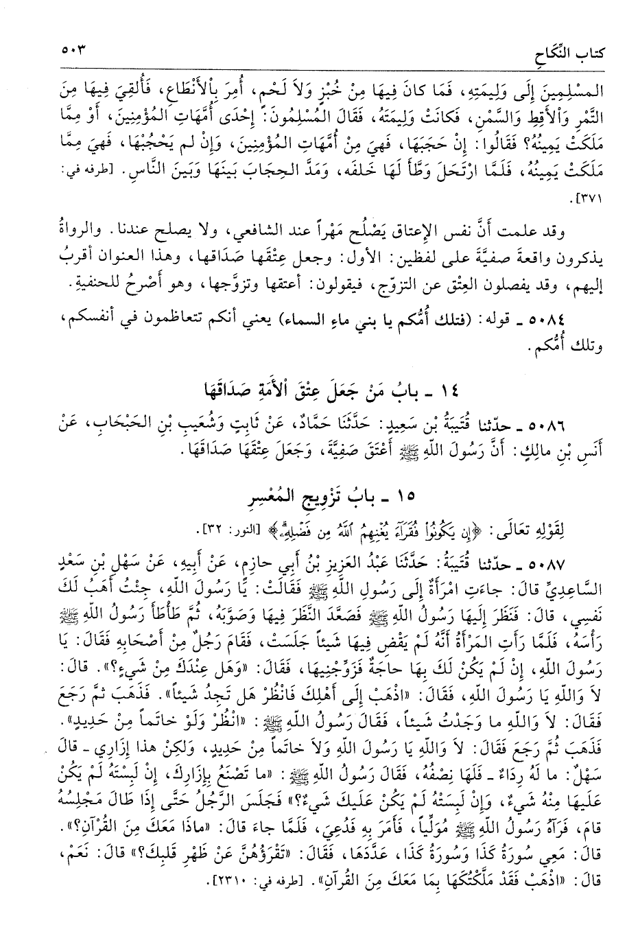 5086 - حَدَّثَنَا قُتَيْبَةُ بْنُ سَعِيدٍ حَدَّثَنَا حَمَّادٌ عَنْ ثَابِتٍ وَشُعَيْبِ بْنِ الْحَبْحَابِ عَنْ أَنَسِ بْنِ مَالِكٍ أَنَّ رَسُولَ اللَّهِ - صلى الله عليه وسلم - أَعْتَقَ صَفِيَّةَ، وَجَعَلَ عِتْقَهَا صَدَاقَهَا. تحفة 291، 912