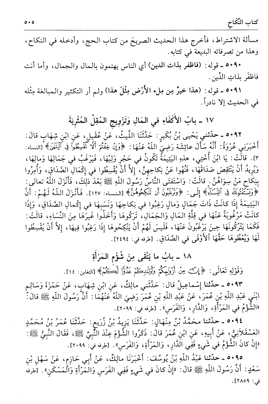 5093 - حَدَّثَنَا إِسْمَاعِيلُ قَالَ حَدَّثَنِى مَالِكٌ عَنِ ابْنِ شِهَابٍ عَنْ حَمْزَةَ وَسَالِمٍ ابْنَىْ عَبْدِ اللَّهِ بْنِ عُمَرَ عَنْ عَبْدِ اللَّهِ بْنِ عُمَرَ - رضى الله عنهما - أَنَّ رَسُولَ اللَّهِ - صلى الله عليه وسلم - قَالَ «الشُّؤْمُ فِى الْمَرْأَةِ وَالدَّارِ وَالْفَرَسِ». أطرافه 2099، 2858، 5094، 5753، 5772 - تحفة 6699، 6911