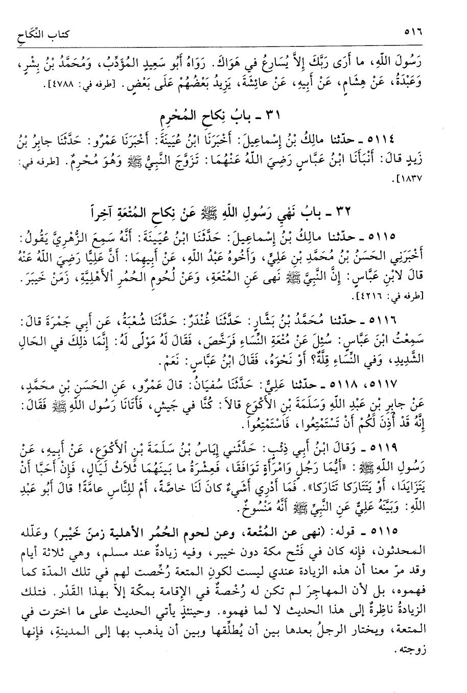 5114 - حَدَّثَنَا مَالِكُ بْنُ إِسْمَاعِيلَ أَخْبَرَنَا ابْنُ عُيَيْنَةَ أَخْبَرَنَا عَمْرٌو حَدَّثَنَا جَابِرُ بْنُ زَيْدٍ قَالَ أَنْبَأَنَا ابْنُ عَبَّاسٍ - رضى الله عنهما - تَزَوَّجَ النَّبِىُّ - صلى الله عليه وسلم - وَهْوَ مُحْرِمٌ. أطرافه 1837، 4258، 4259 - تحفة 5376
