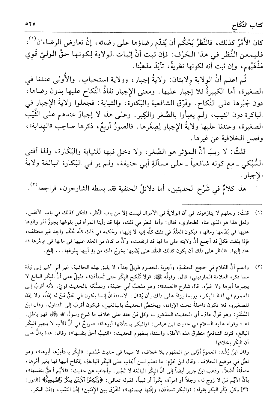 (¬1) قلتُ: ولعلهم لا ينازعوننا في أن الولايةَ في الأموال ليست إلا من باب النَّظر، فلتكن كذلك في باب الأنفس. ولعل هذا هو الذي عناه الطحاوي، فقال: وأما النظر في ذلك، فإنا قد رأينا المرأة قبل بلوغها يجوزُ أمْر والدِها عليها في بُضْعها ومالها، فيكون العَقْدُ في ذلك كلِّه إليه لا إليها، وحُكمه في ذلك كلّه حُكْم واحِد غير مختلف، فإِذا بلغت فكلّ قد أجمع أنَّ ولايته على ما لها قد ارتفعت، وأنَّ ما كان من العقد عليها في مالها في صِغَرها قد عاد إليها. فالنظر على ذلك أن يكون كذلك العَقْد على بُضْعِها يخرجُ ذلك من يدِ أبيها بِبلوغها ... إلخ.