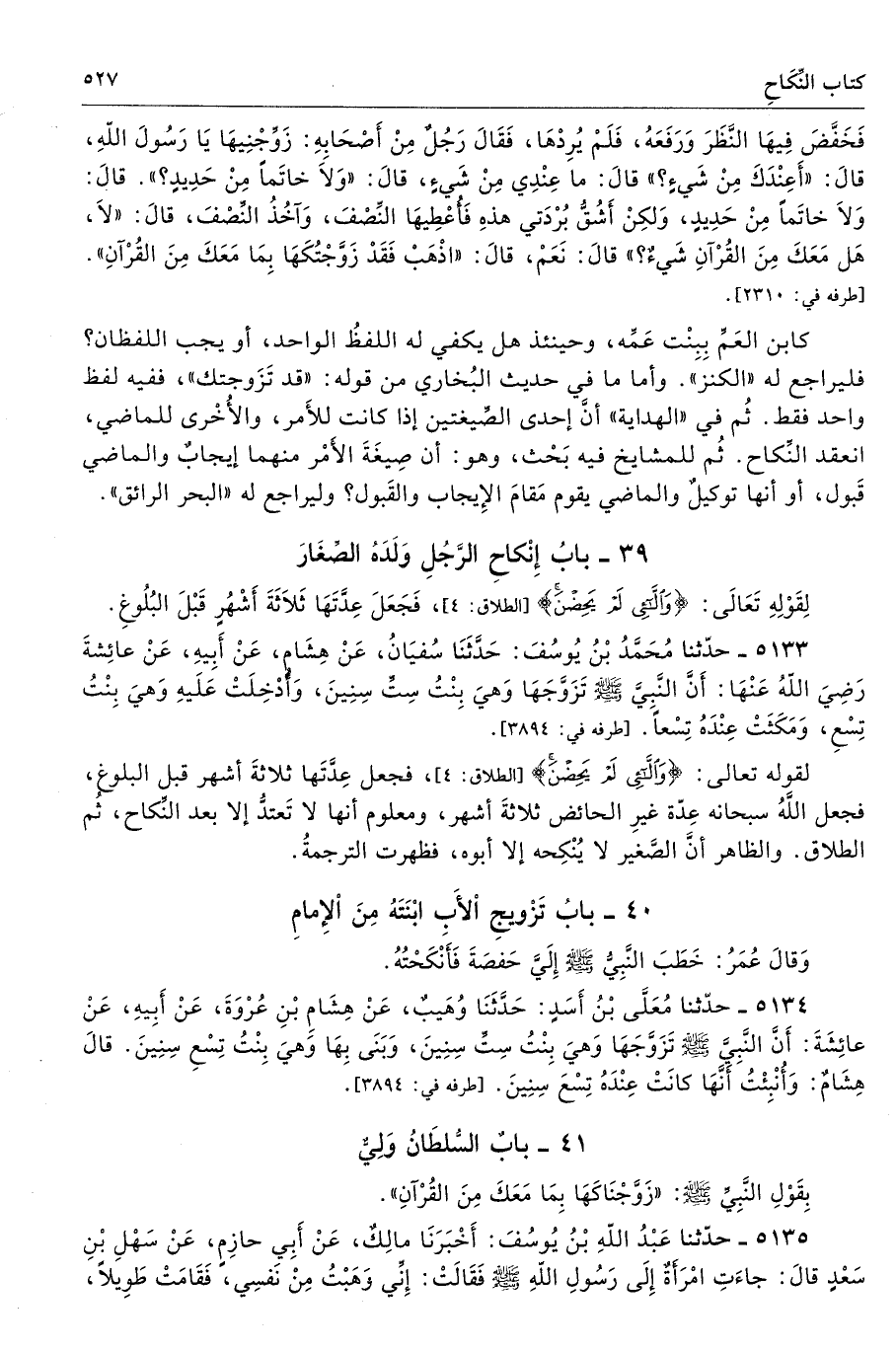 5134 - حَدَّثَنَا مُعَلَّى بْنُ أَسَدٍ حَدَّثَنَا وُهَيْبٌ عَنْ هِشَامِ بْنِ عُرْوَةَ عَنْ أَبِيهِ عَنْ عَائِشَةَ أَنَّ النَّبِىَّ - صلى الله عليه وسلم - تَزَوَّجَهَا وَهْىَ بِنْتُ سِتِّ سِنِينَ، وَبَنَى بِهَا وَهْىَ بِنْتُ تِسْعِ سِنِينَ. قَالَ هِشَامٌ وَأُنْبِئْتُ أَنَّهَا كَانَتْ عِنْدَهُ تِسْعَ سِنِينَ. أطرافه 3894، 3896، 5133، 5156، 5158، 5160 - تحفة 17290