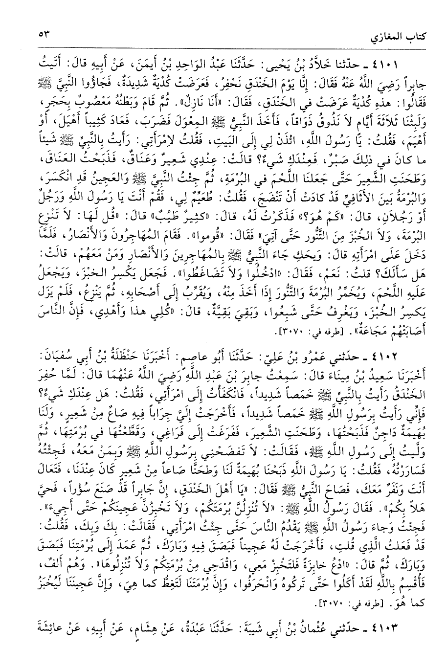 4102 - حَدَّثَنِى عَمْرُو بْنُ عَلِىٍّ حَدَّثَنَا أَبُو عَاصِمٍ أَخْبَرَنَا حَنْظَلَةُ بْنُ أَبِى سُفْيَانَ أَخْبَرَنَا سَعِيدُ بْنُ مِينَاءَ قَالَ سَمِعْتُ جَابِرَ بْنَ عَبْدِ اللَّهِ - رضى الله عنهما - قَالَ لَمَّا حُفِرَ الْخَنْدَقُ رَأَيْتُ بِالنَّبِىِّ - صلى الله عليه وسلم - خَمَصًا شَدِيدًا، فَانْكَفَأْتُ إِلَى امْرَأَتِى فَقُلْتُ هَلْ عِنْدَكِ شَىْءٌ فَإِنِّى رَأَيْتُ بِرَسُولِ اللَّهِ - صلى الله عليه وسلم - خَمَصًا شَدِيدًا. فَأَخْرَجَتْ إِلَىَّ جِرَابًا فِيهِ صَاعٌ مِنْ شَعِيرٍ، وَلَنَا بُهَيْمَةٌ دَاجِنٌ فَذَبَحْتُهَا، وَطَحَنَتِ الشَّعِيرَ فَفَرَغَتْ إِلَى فَرَاغِى، وَقَطَّعْتُهَا فِى بُرْمَتِهَا، ثُمَّ وَلَّيْتُ إِلَى رَسُولِ اللَّهِ - صلى الله عليه وسلم - فَقَالَتْ لاَ تَفْضَحْنِى بِرَسُولِ اللَّهِ - صلى الله عليه وسلم - وَبِمَنْ مَعَهُ. فَجِئْتُهُ فَسَارَرْتُهُ فَقُلْتُ يَا رَسُولَ اللَّهِ ذَبَحْنَا بُهَيْمَةً لَنَا وَطَحَنَّا صَاعًا مِنْ شَعِيرٍ كَانَ عِنْدَنَا، فَتَعَالَ أَنْتَ وَنَفَرٌ مَعَكَ. فَصَاحَ النَّبِىُّ - صلى الله عليه وسلم - فَقَالَ «يَا أَهْلَ الْخَنْدَقِ، إِنَّ جَابِرًا قَدْ صَنَعَ سُورًا فَحَىَّ هَلاً بِكُمْ». فَقَالَ رَسُولُ اللَّهِ - صلى الله عليه وسلم - «لاَ تُنْزِلُنَّ بُرْمَتَكُمْ، وَلاَ تَخْبِزُنَّ عَجِينَكُمْ حَتَّى أَجِىءَ». فَجِئْتُ وَجَاءَ رَسُولُ اللَّهِ - صلى الله عليه وسلم - يَقْدُمُ النَّاسَ حَتَّى جِئْتُ امْرَأَتِى، فَقَالَتْ بِكَ وَبِكَ. فَقُلْتُ قَدْ فَعَلْتُ الَّذِى قُلْتِ. فَأَخْرَجَتْ لَهُ عَجِينًا، فَبَصَقَ فِيهِ وَبَارَكَ، ثُمَّ عَمَدَ إِلَى بُرْمَتِنَا فَبَصَقَ وَبَارَكَ ثُمَّ قَالَ «ادْعُ خَابِزَةً فَلْتَخْبِزْ مَعِى وَاقْدَحِى مِنْ بُرْمَتِكُمْ وَلاَ تُنْزِلُوهَا، وَهُمْ أَلْفٌ، فَأُقْسِمُ بِاللَّهِ لَقَدْ أَكَلُوا حَتَّى تَرَكُوهُ وَانْحَرَفُوا، وَإِنَّ بُرْمَتَنَا لَتَغِطُّ كَمَا هِىَ، وَإِنَّ عَجِينَنَا لَيُخْبَزُ كَمَا هُوَ. طرفاه 3070، 4101 - تحفة 2263