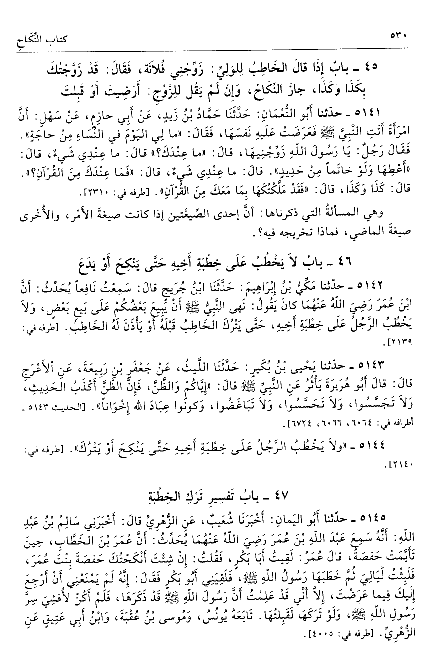 5144 - «وَلاَ يَخْطُبُ الرَّجُلُ عَلَى خِطْبَةِ أَخِيهِ، حَتَّى يَنْكِحَ، أَوْ يَتْرُكَ». أطرافه 2140، 2148، 2150، 2151، 2160، 2162، 2723، 2727، 5152، 6601 - تحفة 13636