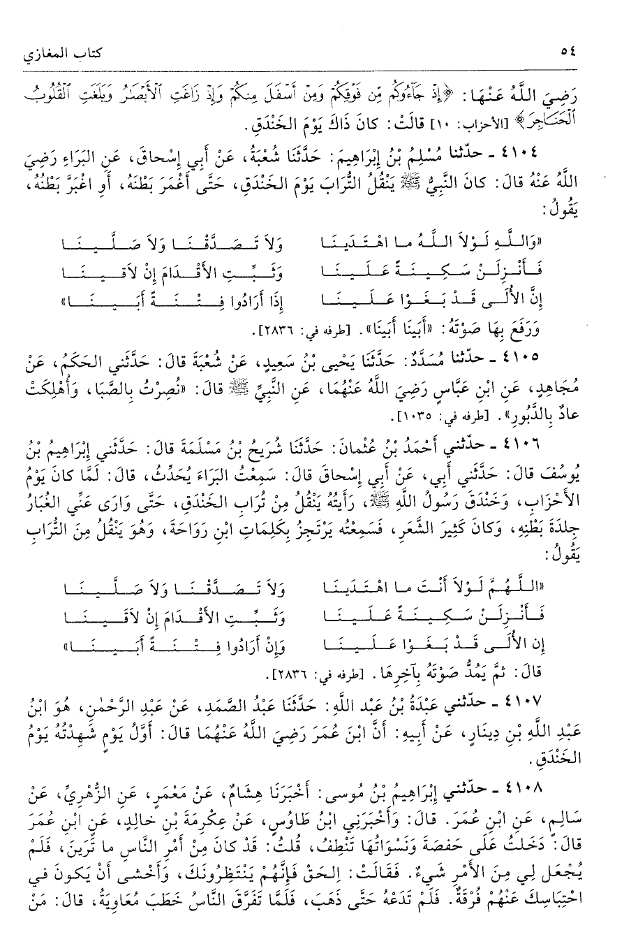 4106 - حَدَّثَنِى أَحْمَدُ بْنُ عُثْمَانَ حَدَّثَنَا شُرَيْحُ بْنُ مَسْلَمَةَ قَالَ حَدَّثَنِى إِبْرَاهِيمُ بْنُ يُوسُفَ قَالَ حَدَّثَنِى أَبِى عَنْ أَبِى إِسْحَاقَ قَالَ سَمِعْتُ الْبَرَاءَ يُحَدِّثُ قَالَ لَمَّا كَانَ يَوْمُ الأَحْزَابِ، وَخَنْدَقَ رَسُولُ اللَّهِ - صلى الله عليه وسلم - رَأَيْتُهُ يَنْقُلُ مِنْ تُرَابِ الْخَنْدَقِ حَتَّى وَارَى عَنِّى الْغُبَارُ جِلْدَةَ بَطْنِهِ، وَكَانَ كَثِيرَ الشَّعَرِ، فَسَمِعْتُهُ يَرْتَجِزُ بِكَلِمَاتِ ابْنِ رَوَاحَةَ، وَهْوَ يَنْقُلُ مِنَ التُّرَابِ يَقُولُ
