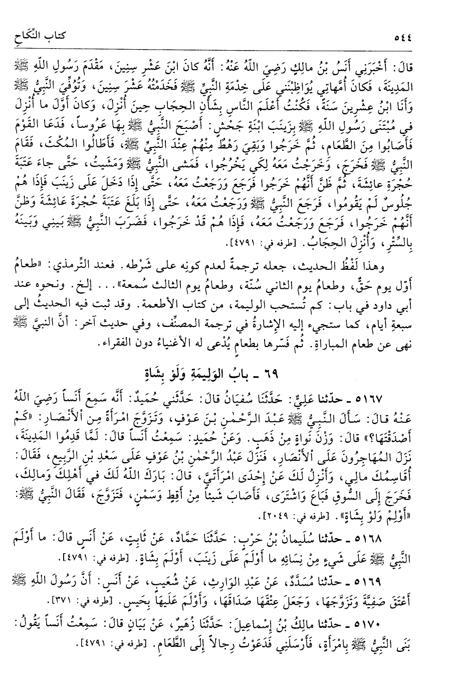 قَالَ أَخْبَرَنِى أَنَسُ بْنُ مَالِكٍ - رضى الله عنه - أَنَّهُ كَانَ ابْنَ عَشْرِ سِنِينَ مَقْدَمَ رَسُولِ اللَّهِ - صلى الله عليه وسلم - الْمَدِينَةَ، فَكَانَ أُمَّهَاتِى يُوَاظِبْنَنِى عَلَى خِدْمَةِ النَّبِىِّ - صلى الله عليه وسلم - فَخَدَمْتُهُ عَشْرَ سِنِينَ، وَتُوُفِّىَ النَّبِىُّ - صلى الله عليه وسلم - وَأَنَا ابْنُ عِشْرِينَ سَنَةً، فَكُنْتُ أَعْلَمَ النَّاسِ بِشَأْنِ الْحِجَابِ حِينَ أُنْزِلَ، وَكَانَ أَوَّلَ مَا أُنْزِلَ فِى مُبْتَنَى رَسُولِ اللَّهِ - صلى الله عليه وسلم - بِزَيْنَبَ ابْنَةِ جَحْشٍ، أَصْبَحَ النَّبِىُّ - صلى الله عليه وسلم - بِهَا عَرُوسًا، فَدَعَا الْقَوْمَ فَأَصَابُوا مِنَ الطَّعَامِ، ثُمَّ خَرَجُوا وَبَقِىَ رَهْطٌ مِنْهُمْ عِنْدَ النَّبِىِّ - صلى الله عليه وسلم - فَأَطَالُوا الْمُكْثَ، فَقَامَ النَّبِىُّ - صلى الله عليه وسلم - فَخَرَجَ وَخَرَجْتُ مَعَهُ لِكَىْ يَخْرُجُوا، فَمَشَى النَّبِىُّ - صلى الله عليه وسلم - وَمَشَيْتُ، حَتَّى جَاءَ عَتَبَةَ حُجْرَةِ عَائِشَةَ، ثُمَّ ظَنَّ أَنَّهُمْ خَرَجُوا فَرَجَعَ وَرَجَعْتُ مَعَهُ، حَتَّى إِذَا دَخَلَ عَلَى زَيْنَبَ فَإِذَا هُمْ جُلُوسٌ لَمْ يَقُومُوا، فَرَجَعَ النَّبِىُّ - صلى الله عليه وسلم - وَرَجَعْتُ مَعَهُ، حَتَّى إِذَا بَلَغَ عَتَبَةَ حُجْرَةِ عَائِشَةَ، وَظَنَّ أَنَّهُمْ خَرَجُوا، فَرَجَعَ وَرَجَعْتُ مَعَهُ فَإِذَا هُمْ قَدْ خَرَجُوا فَضَرَبَ النَّبِىُّ - صلى الله عليه وسلم - بَيْنِى وَبَيْنَهُ بِالسِّتْرِ، وَأُنْزِلَ الْحِجَابُ. أطرافه 4791، 4792، 4793، 4794، 5154، 5163، 5168، 5170، 5171، 5466، 6238، 6239، 6271، 7421 - تحفة 1519