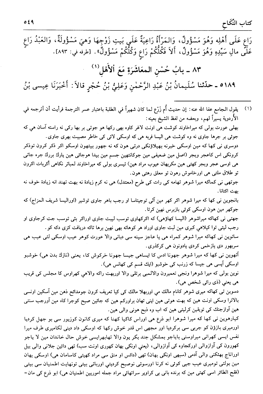 رَاعٍ عَلَى أَهْلِهِ وَهْوَ مَسْئُولٌ وَالْمَرْأَةُ رَاعِيَةٌ عَلَى بَيْتِ زَوْجِهَا وَهْىَ مَسْئُولَةٌ، وَالْعَبْدُ رَاعٍ عَلَى مَالِ سَيِّدِهِ وَهُوَ مَسْئُولٌ، أَلاَ فَكُلُّكُمْ رَاعٍ وَكُلُّكُمْ مَسْئُولٌ». أطرافه 893، 2409، 2554، 2558، 2751، 5200، 7138 تحفة 7528