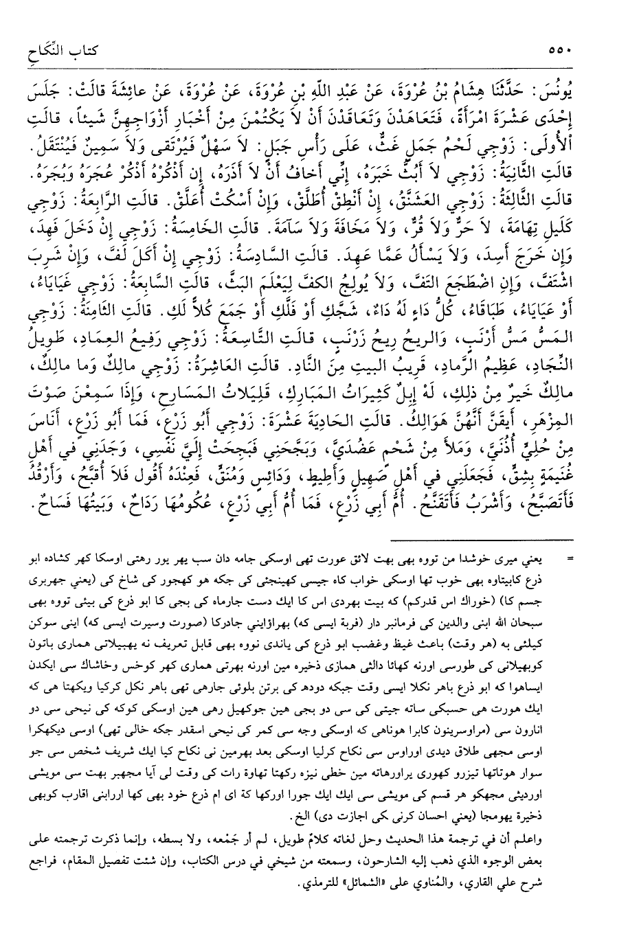 يُونُسَ حَدَّثَنَا هِشَامُ بْنُ عُرْوَةَ عَنْ عَبْدِ اللَّهِ بْنِ عُرْوَةَ عَنْ عُرْوَةَ عَنْ عَائِشَةَ قَالَتْ جَلَسَ إِحْدَى عَشْرَةَ امْرَأَةً، فَتَعَاهَدْنَ وَتَعَاقَدْنَ أَنْ لاَ يَكْتُمْنَ مِنْ أَخْبَارِ أَزْوَاجِهِنَّ شَيْئًا. قَالَتِ الأُولَى زَوْجِى لَحْمُ جَمَلٍ، غَثٌّ عَلَى رَأْسِ جَبَلٍ، لاَ سَهْلٍ فَيُرْتَقَى، وَلاَ سَمِينٍ فَيُنْتَقَلُ. قَالَتِ الثَّانِيَةُ زَوْجِى لاَ أَبُثُّ خَبَرَهُ، إِنِّى أَخَافُ أَنْ لاَ أَذَرَهُ، إِنْ أَذْكُرْهُ أَذْكُرْ عُجَرَهُ وَبُجَرَهُ. قَالَتِ الثَّالِثَةُ زَوْجِى الْعَشَنَّقُ، إِنْ أَنْطِقْ أُطَلَّقْ وَإِنْ أَسْكُتْ أُعَلَّقْ. قَالَتِ الرَّابِعَةُ زَوْجِى كَلَيْلِ تِهَامَةَ، لاَ حَرٌّ، وَلاَ قُرٌّ، وَلاَ مَخَافَةَ، وَلاَ سَآمَةَ. قَالَتِ الْخَامِسَةُ زَوْجِى إِنْ دَخَلَ فَهِدَ، وَإِنْ خَرَجَ أَسِدَ، وَلاَ يَسْأَلُ عَمَّا عَهِدَ. قَالَتِ السَّادِسَةُ زَوْجِى إِنْ أَكَلَ لَفَّ، وَإِنْ شَرِبَ اشْتَفَّ، وَإِنِ اضْطَجَعَ الْتَفَّ، وَلاَ يُولِجُ الْكَفَّ لِيَعْلَمَ الْبَثَّ، قَالَتِ السَّابِعَةُ زَوْجِى غَيَايَاءُ أَوْ عَيَايَاءُ طَبَاقَاءُ، كُلُّ دَاءٍ لَهُ دَاءٌ، شَجَّكِ أَوْ فَلَّكِ أَوْ جَمَعَ كُلاًّ لَكِ. قَالَتِ الثَّامِنَةُ زَوْجِى الْمَسُّ مَسُّ أَرْنَبٍ، وَالرِّيحُ رِيحُ زَرْنَبٍ. قَالَتِ التَّاسِعَةُ زَوْجِى رَفِيعُ الْعِمَادِ، طَوِيلُ النِّجَادِ، عَظِيمُ الرَّمَادِ، قَرِيبُ الْبَيْتِ مِنَ النَّادِ. قَالَتِ الْعَاشِرَةُ زَوْجِى مَالِكٌ وَمَا مَالِكٌ، مَالِكٌ خَيْرٌ مِنْ ذَلِكِ، لَهُ إِبِلٌ كَثِيرَاتُ الْمَبَارِكِ قَلِيلاَتُ الْمَسَارِحِ، وَإِذَا سَمِعْنَ صَوْتَ الْمِزْهَرِ أَيْقَنَّ أَنَّهُنَّ هَوَالِكُ. قَالَتِ الْحَادِيَةَ عَشْرَةَ زَوْجِى أَبُو زَرْعٍ فَمَا أَبُو زَرْعٍ أَنَاسَ مِنْ حُلِىٍّ أُذُنَىَّ، وَمَلأَ مِنْ شَحْمٍ عَضُدَىَّ، وَبَجَّحَنِى فَبَجِحَتْ إِلَىَّ نَفْسِى، وَجَدَنِى فِى أَهْلِ غُنَيْمَةٍ بِشِقٍّ، فَجَعَلَنِى فِى أَهْلِ صَهِيلٍ وَأَطِيطٍ وَدَائِسٍ وَمُنَقٍّ، فَعِنْدَهُ أَقُولُ فَلاَ أُقَبَّحُ وَأَرْقُدُ فَأَتَصَبَّحُ، وَأَشْرَبُ فَأَتَقَنَّحُ، أُمُّ أَبِى زَرْعٍ فَمَا أُمُّ أَبِى زَرْعٍ عُكُومُهَا رَدَاحٌ، وَبَيْتُهَا فَسَاحٌ.