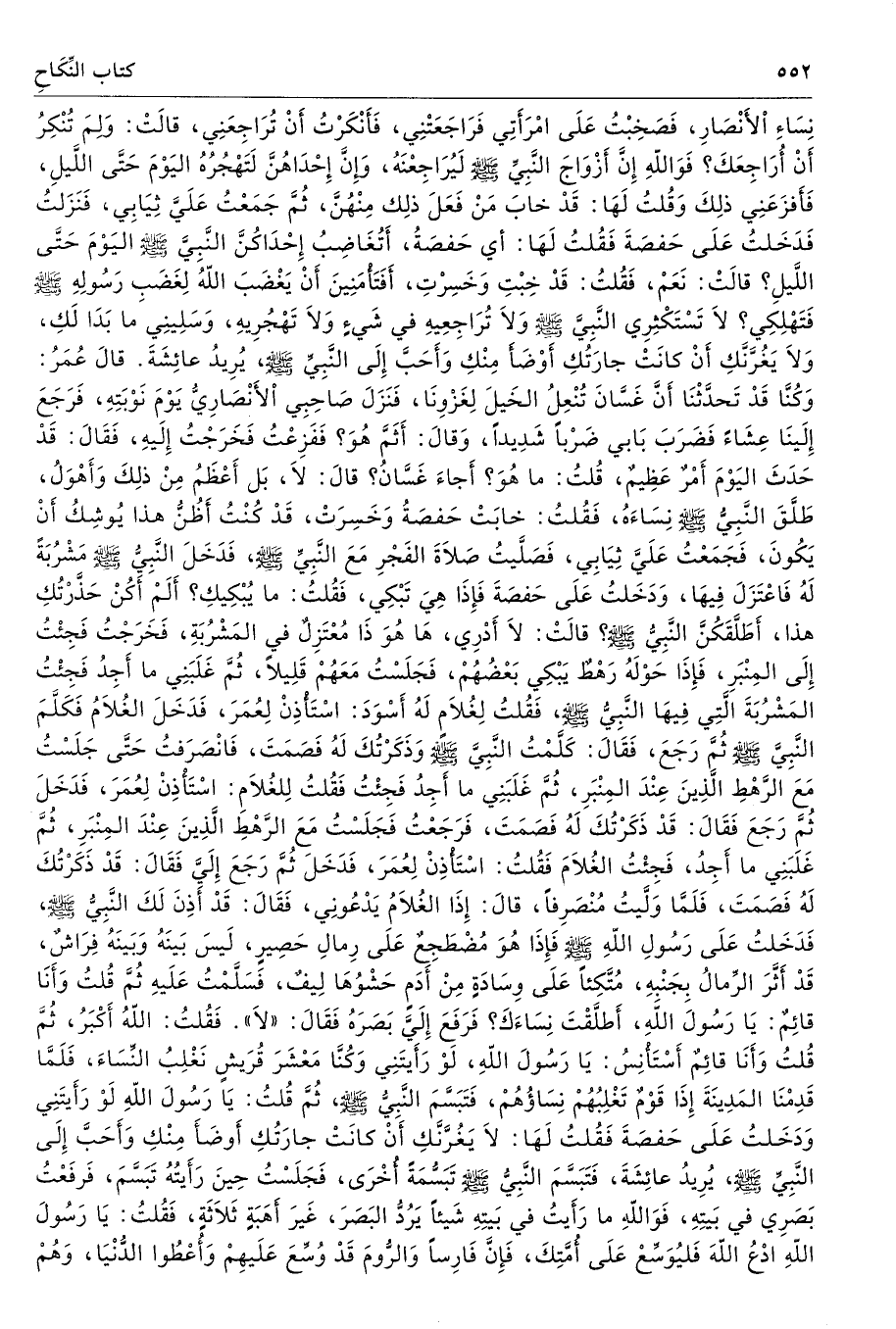 نِسَاءِ الأَنْصَارِ، فَصَخِبْتُ عَلَى امْرَأَتِى فَرَاجَعَتْنِى فَأَنْكَرْتُ أَنْ تُرَاجِعَنِى قَالَتْ وَلِمَ تُنْكِرُ أَنْ أُرَاجِعَكَ فَوَاللَّهِ إِنَّ أَزْوَاجَ النَّبِىِّ - صلى الله عليه وسلم - لَيُرَاجِعْنَهُ، وَإِنَّ إِحْدَاهُنَّ لَتَهْجُرُهُ الْيَوْمَ حَتَّى اللَّيْلِ. فَأَفْزَعَنِى ذَلِكَ وَقُلْتُ لَهَا وَقَدْ خَابَ مَنْ فَعَلَ ذَلِكَ مِنْهُنَّ. ثُمَّ جَمَعْتُ عَلَىَّ ثِيَابِى فَنَزَلْتُ فَدَخَلْتُ عَلَى حَفْصَةَ فَقُلْتُ لَهَا أَىْ حَفْصَةُ أَتُغَاضِبُ إِحْدَاكُنَّ النَّبِىَّ - صلى الله عليه وسلم - الْيَوْمَ حَتَّى اللَّيْلِ قَالَتْ نَعَمْ. فَقُلْتُ قَدْ خِبْتِ وَخَسِرْتِ، أَفَتَأْمَنِينَ أَنْ يَغْضَبَ اللَّهُ لِغَضَبِ رَسُولِهِ - صلى الله عليه وسلم - فَتَهْلِكِى لاَ تَسْتَكْثِرِى النَّبِىَّ - صلى الله عليه وسلم - وَلاَ تُرَاجِعِيهِ فِى شَىْءٍ، وَلاَ تَهْجُرِيهِ، وَسَلِينِى مَا بَدَا لَكِ، وَلاَ يَغُرَّنَّكِ أَنْ كَانَتْ جَارَتُكِ أَوْضَأَ مِنْكِ، وَأَحَبَّ إِلَى النَّبِىِّ - صلى الله عليه وسلم - يُرِيدُ عَائِشَةَ - قَالَ عُمَرُ وَكُنَّا قَدْ تَحَدَّثْنَا أَنَّ غَسَّانَ تُنْعِلُ الْخَيْلَ لِغَزْوِنَا، فَنَزَلَ صَاحِبِى الأَنْصَارِىُّ يَوْمَ نَوْبَتِهِ، فَرَجَعَ إِلَيْنَا عِشَاءً فَضَرَبَ بَابِى ضَرْبًا شَدِيدًا وَقَالَ أَثَمَّ هُوَ فَفَزِعْتُ فَخَرَجْتُ إِلَيْهِ، فَقَالَ قَدْ حَدَثَ الْيَوْمَ أَمْرٌ عَظِيمٌ. قُلْتُ مَا هُوَ، أَجَاءَ غَسَّانُ قَالَ لاَ بَلْ أَعْظَمُ مِنْ ذَلِكَ وَأَهْوَلُ، طَلَّقَ النَّبِىُّ - صلى الله عليه وسلم - نِسَاءَهُ. فَقُلْتُ خَابَتْ حَفْصَةُ وَخَسِرَتْ، قَدْ كُنْتُ أَظُنُّ هَذَا يُوشِكُ أَنْ يَكُونَ، فَجَمَعْتُ عَلَىَّ ثِيَابِى فَصَلَّيْتُ صَلاَةَ الْفَجْرِ مَعَ النَّبِىِّ - صلى الله عليه وسلم - فَدَخَلَ النَّبِىُّ - صلى الله عليه وسلم - مَشْرُبَةً لَهُ، فَاعْتَزَلَ فِيهَا، وَدَخَلْتُ عَلَى حَفْصَةَ فَإِذَا هِىَ تَبْكِى فَقُلْتُ مَا يُبْكِيكِ أَلَمْ أَكُنْ حَذَّرْتُكِ هَذَا أَطَلَّقَكُنَّ النَّبِىُّ - صلى الله عليه وسلم - قَالَتْ لاَ أَدْرِى هَا هُوَ ذَا مُعْتَزِلٌ فِى الْمَشْرُبَةِ. فَخَرَجْتُ فَجِئْتُ إِلَى الْمِنْبَرِ فَإِذَا حَوْلَهُ رَهْطٌ يَبْكِى بَعْضُهُمْ، فَجَلَسْتُ مَعَهُمْ قَلِيلاً ثُمَّ غَلَبَنِى مَا أَجِدُ، فَجِئْتُ الْمَشْرُبَةَ الَّتِى فِيهَا النَّبِىُّ - صلى الله عليه وسلم - فَقُلْتُ لِغُلاَمٍ لَهُ أَسْوَدَ اسْتَأْذِنْ لِعُمَرَ. فَدَخَلَ الْغُلاَمُ فَكَلَّمَ النَّبِىَّ - صلى الله عليه وسلم - ثُمَّ رَجَعَ فَقَالَ كَلَّمْتُ النَّبِىَّ - صلى الله عليه وسلم - وَذَكَرْتُكَ لَهُ، فَصَمَتَ. فَانْصَرَفْتُ حَتَّى جَلَسْتُ مَعَ الرَّهْطِ الَّذِينَ عِنْدَ الْمِنْبَرِ، ثُمَّ غَلَبَنِى مَا أَجِدُ فَجِئْتُ فَقُلْتُ لِلْغُلاَمِ اسْتَأْذِنْ لِعُمَرَ. فَدَخَلَ ثُمَّ رَجَعَ فَقَالَ قَدْ ذَكَرْتُكَ لَهُ فَصَمَتَ. فَرَجَعْتُ فَجَلَسْتُ مَعَ الرَّهْطِ الَّذِينَ عِنْدَ الْمِنْبَرِ، ثُمَّ غَلَبَنِى مَا أَجِدُ فَجِئْتُ الْغُلاَمَ فَقُلْتُ اسْتَأْذِنْ لِعُمَرَ. فَدَخَلَ ثُمَّ رَجَعَ إِلَىَّ فَقَالَ قَدْ ذَكَرْتُكَ لَهُ فَصَمَتَ. فَلَمَّا وَلَّيْتُ مُنْصَرِفًا - قَالَ - إِذَا الْغُلاَمُ يَدْعُونِى فَقَالَ قَدْ أَذِنَ لَكَ النَّبِىُّ - صلى الله عليه وسلم - فَدَخَلْتُ عَلَى رَسُولِ اللَّهِ - صلى الله عليه وسلم - فَإِذَا هُوَ مُضْطَجِعٌ عَلَى رِمَالِ حَصِيرٍ، لَيْسَ بَيْنَهُ وَبَيْنَهُ فِرَاشٌ، قَدْ أَثَّرَ الرِّمَالُ بِجَنْبِهِ مُتَّكِئًا عَلَى وِسَادَةٍ مِنْ أَدَمٍ حَشْوُهَا لِيفٌ، فَسَلَّمْتُ عَلَيْهِ ثُمَّ قُلْتُ وَأَنَا قَائِمٌ يَا رَسُولَ اللَّهِ أَطَلَّقْتَ نِسَاءَكَ. فَرَفَعَ إِلَىَّ بَصَرَهُ فَقَالَ «لاَ». فَقُلْتُ اللَّهُ أَكْبَرُ. ثُمَّ قُلْتُ 