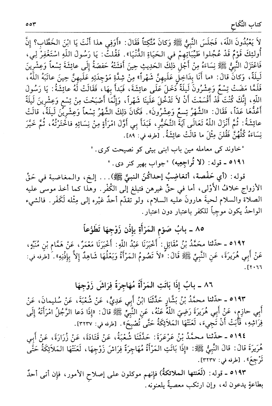 5194 - حَدَّثَنَا مُحَمَّدُ بْنُ عَرْعَرَةَ حَدَّثَنَا شُعْبَةُ عَنْ قَتَادَةَ عَنْ زُرَارَةَ عَنْ أَبِى هُرَيْرَةَ قَالَ قَالَ النَّبِىُّ - صلى الله عليه وسلم - «إِذَا بَاتَتِ الْمَرْأَةُ مُهَاجِرَةً فِرَاشَ زَوْجِهَا لَعَنَتْهَا الْمَلاَئِكَةُ حَتَّى تَرْجِعَ». طرفاه 3237، 5193 - تحفة 12897