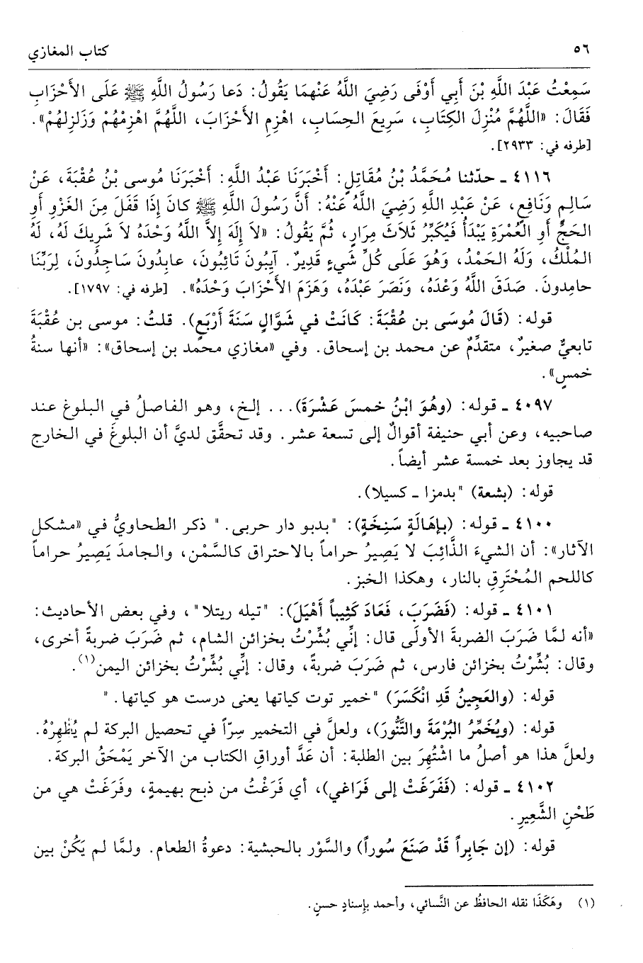 4116 - حَدَّثَنَا مُحَمَّدُ بْنُ مُقَاتِلٍ أَخْبَرَنَا عَبْدُ اللَّهِ أَخْبَرَنَا مُوسَى بْنُ عُقْبَةَ عَنْ سَالِمٍ وَنَافِعٍ عَنْ عَبْدِ اللَّهِ - رضى الله عنه - أَنَّ رَسُولَ اللَّهِ - صلى الله عليه وسلم - كَانَ إِذَا قَفَلَ مِنَ الْغَزْوِ، أَوِ الْحَجِّ، أَوِ الْعُمْرَةِ، يَبْدَأُ فَيُكَبِّرُ ثَلاَثَ مِرَارٍ ثُمَّ يَقُولُ «لاَ إِلَهَ إِلَّا اللَّهُ وَحْدَهُ لاَ شَرِيكَ لَهُ، لَهُ الْمُلْكُ وَلَهُ الْحَمْدُ، وَهْوَ عَلَى كُلِّ شَىْءٍ قَدِيرٌ، آيِبُونَ تَائِبُونَ عَابِدُونُ سَاجِدُونَ، لِرَبِّنَا حَامِدُونَ، صَدَقَ اللَّهُ وَعْدَهُ، وَنَصَرَ عَبْدَهُ، وَهَزَمَ الأَحْزَابَ وَحْدَهُ». أطرافه 1797، 2995، 3084، 6385 - تحفة 7030، 8482