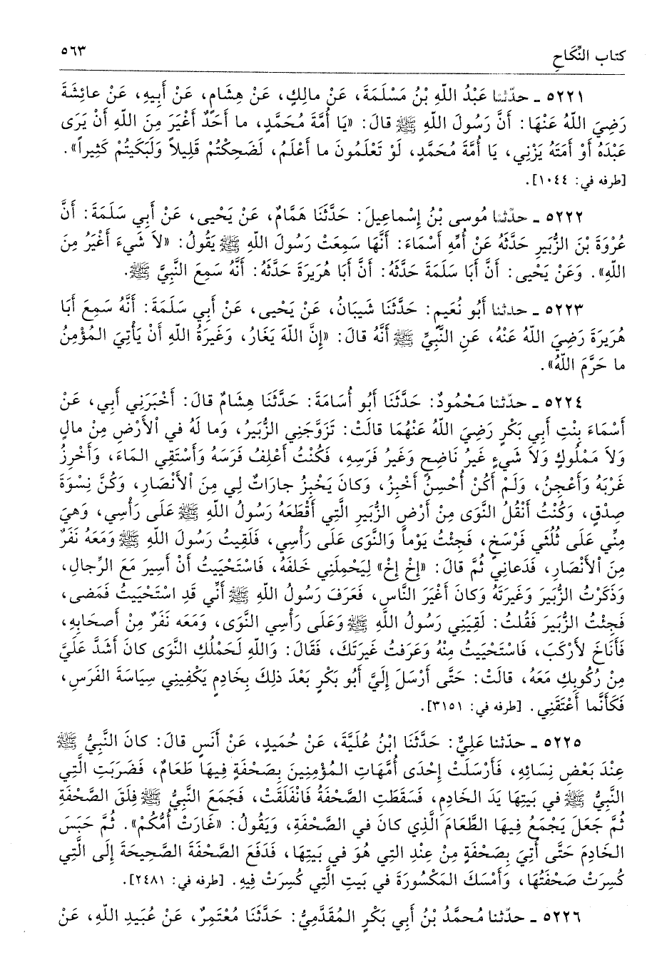 5224 - حَدَّثَنَا مَحْمُودٌ حَدَّثَنَا أَبُو أُسَامَةَ حَدَّثَنَا هِشَامٌ قَالَ أَخْبَرَنِى أَبِى عَنْ أَسْمَاءَ بِنْتِ أَبِى بَكْرٍ - رضى الله عنهما - قَالَتْ تَزَوَّجَنِى الزُّبَيْرُ، وَمَا لَهُ فِى الأَرْضِ مِنْ مَالٍ، وَلاَ مَمْلُوكٍ، وَلاَ شَىْءٍ غَيْرَ نَاضِحٍ، وَغَيْرَ فَرَسِهِ، فَكُنْتُ أَعْلِفُ فَرَسَهُ، وَأَسْتَقِى الْمَاءَ، وَأَخْرِزُ غَرْبَهُ وَأَعْجِنُ، وَلَمْ أَكُنْ أُحْسِنُ أَخْبِزُ، وَكَانَ يَخْبِزُ جَارَاتٌ لِى مِنَ الأَنْصَارِ وَكُنَّ نِسْوَةَ صِدْقٍ، وَكُنْتُ أَنْقُلُ النَّوَى مِنْ أَرْضِ الزُّبَيْرِ الَّتِى أَقْطَعَهُ رَسُولُ اللَّهِ - صلى الله عليه وسلم - عَلَى رَأْسِى، وَهْىَ مِنِّى عَلَى ثُلُثَىْ فَرْسَخٍ، فَجِئْتُ يَوْمًا وَالنَّوَى عَلَى رَأْسِى فَلَقِيتُ رَسُولَ اللَّهِ - صلى الله عليه وسلم - وَمَعَهُ نَفَرٌ مِنَ الأَنْصَارِ فَدَعَانِى ثُمَّ قَالَ «إِخْ إِخْ». لِيَحْمِلَنِى خَلْفَهُ، فَاسْتَحْيَيْتُ أَنْ أَسِيرَ مَعَ الرِّجَالِ، وَذَكَرْتُ الزُّبَيْرَ وَغَيْرَتَهُ، وَكَانَ أَغْيَرَ النَّاسِ، فَعَرَفَ رَسُولُ اللَّهِ - صلى الله عليه وسلم - أَنِّى قَدِ اسْتَحْيَيْتُ فَمَضَى، فَجِئْتُ الزُّبَيْرَ فَقُلْتُ لَقِيَنِى رَسُولُ اللَّهِ - صلى الله عليه وسلم - وَعَلَى رَأْسِى النَّوَى، وَمَعَهُ نَفَرٌ مِنْ أَصْحَابِهِ، فَأَنَاخَ لأَرْكَبَ، فَاسْتَحْيَيْتُ مِنْهُ وَعَرَفْتُ غَيْرَتَكَ. فَقَالَ وَاللَّهِ لَحَمْلُكِ النَّوَى كَانَ أَشَدَّ عَلَىَّ مِنْ رُكُوبِكِ مَعَهُ. قَالَتْ حَتَّى أَرْسَلَ إِلَىَّ أَبُو بَكْرٍ بَعْدَ ذَلِكَ بِخَادِمٍ يَكْفِينِى سِيَاسَةَ الْفَرَسِ، فَكَأَنَّمَا أَعْتَقَنِى. طرفه 3151 - تحفة 15725، 3649 أ - 46/ 7