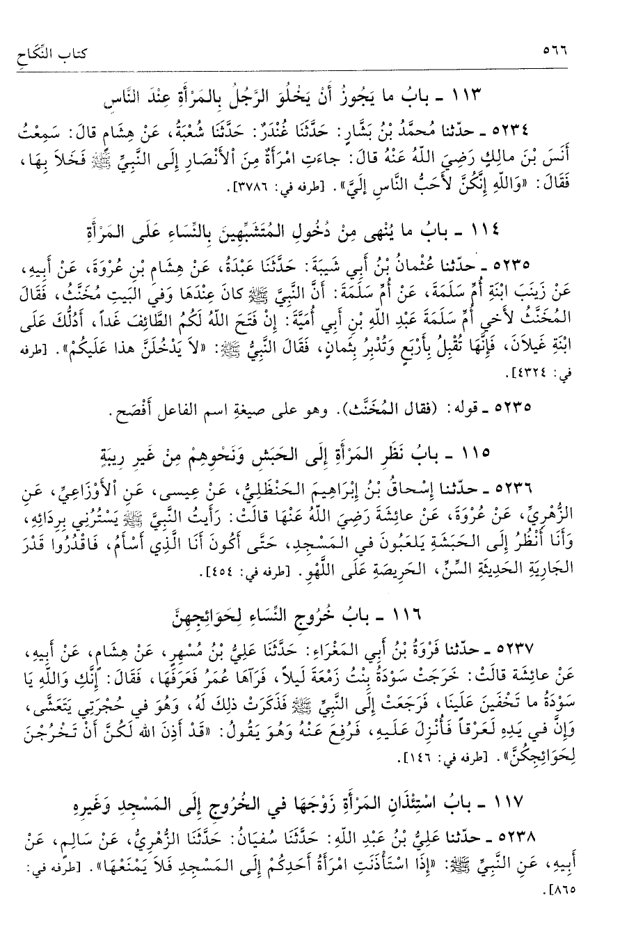5235 - حَدَّثَنَا عُثْمَانُ بْنُ أَبِى شَيْبَةَ حَدَّثَنَا عَبْدَةُ عَنْ هِشَامِ بْنِ عُرْوَةَ عَنْ أَبِيهِ عَنْ زَيْنَبَ ابْنَةِ أُمِّ سَلَمَةَ عَنْ أُمِّ سَلَمَةَ أَنَّ النَّبِىَّ - صلى الله عليه وسلم - كَانَ عِنْدَهَا وَفِى الْبَيْتِ مُخَنَّثٌ، فَقَالَ الْمُخَنَّثُ لأَخِى أُمِّ سَلَمَةَ عَبْدِ اللَّهِ بْنِ أَبِى أُمَيَّةَ إِنْ فَتَحَ اللَّهُ عَلَيْكُمُ الطَّائِفَ غَدًا أَدُلُّكَ عَلَى ابْنَةِ غَيْلاَنَ، فَإِنَّهَا تُقْبِلُ بِأَرْبَعٍ وَتُدْبِرُ بِثَمَانٍ. فَقَالَ النَّبِىُّ - صلى الله عليه وسلم - «لاَ يَدْخُلَنَّ هَذَا عَلَيْكُنَّ». طرفاه 4324، 5887 - تحفة 18263