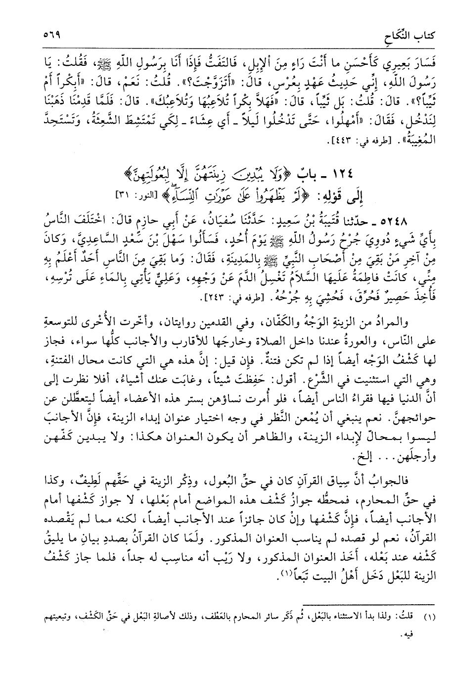 124 - باب {وَلَا يُبْدِينَ زِينَتَهُنَّ إِلَّا لِبُعُولَتِهِنَّ} إِلَى قَوْلِهِ: {لَمْ يَظْهَرُوا عَلَى عَوْرَاتِ النِّسَاءِ} [النور: 31]