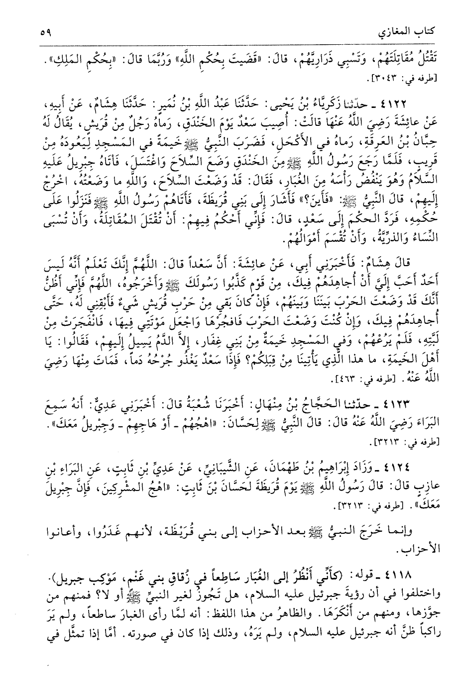 4122 - حَدَّثَنَا زَكَرِيَّاءُ بْنُ يَحْيَى حَدَّثَنَا عَبْدُ اللَّهِ بْنُ نُمَيْرٍ حَدَّثَنَا هِشَامٌ عَنْ أَبِيهِ عَنْ عَائِشَةَ - رضى الله عنها - قَالَتْ أُصِيبَ سَعْدٌ يَوْمَ الْخَنْدَقِ، رَمَاهُ رَجُلٌ مِنْ قُرَيْشٍ يُقَالُ لَهُ حِبَّانُ ابْنُ الْعَرِقَةِ، رَمَاهُ فِى الأَكْحَلِ، فَضَرَبَ النَّبِىُّ - صلى الله عليه وسلم - خَيْمَةً فِى الْمَسْجِدِ لِيَعُودَهُ مِنْ قَرِيبٍ، فَلَمَّا رَجَعَ رَسُولُ اللَّهِ - صلى الله عليه وسلم - مِنَ الْخَنْدَقِ وَضَعَ السِّلاَحَ وَاغْتَسَلَ، فَأَتَاهُ جِبْرِيلُ - عَلَيْهِ السَّلاَمُ - وَهْوَ يَنْفُضُ رَأْسَهُ مِنَ الْغُبَارِ فَقَالَ قَدْ وَضَعْتَ السِّلاَحَ وَاللَّهِ مَا وَضَعْتُهُ، اخْرُجْ إِلَيْهِمْ. قَالَ النَّبِىُّ - صلى الله عليه وسلم - «فَأَيْنَ». فَأَشَارَ إِلَى بَنِى قُرَيْظَةَ، فَأَتَاهُمْ رَسُولُ اللَّهِ - صلى الله عليه وسلم - فَنَزَلُوا عَلَى حُكْمِهِ، فَرَدَّ الْحُكْمَ إِلَى سَعْدٍ، قَالَ فَإِنِّى أَحْكُمُ فِيهِمْ أَنْ تُقْتَلَ الْمُقَاتِلَةُ، وَأَنْ تُسْبَى النِّسَاءُ وَالذُّرِّيَّةُ، وَأَنْ تُقْسَمَ أَمْوَالُهُمْ.