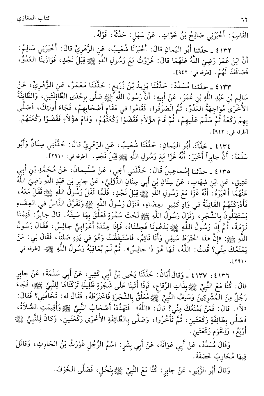 4133 - حَدَّثَنَا مُسَدَّدٌ حَدَّثَنَا يَزِيدُ بْنُ زُرَيْعٍ حَدَّثَنَا مَعْمَرٌ عَنِ الزُّهْرِىِّ عَنْ سَالِمِ بْنِ عَبْدِ اللَّهِ بْنِ عُمَرَ عَنْ أَبِيهِ أَنَّ رَسُولَ اللَّهِ - صلى الله عليه وسلم - صَلَّى بِإِحْدَى الطَّائِفَتَيْنِ، وَالطَّائِفَةُ الأُخْرَى مُوَاجِهَةُ الْعَدُوِّ، ثُمَّ انْصَرَفُوا، فَقَامُوا فِى مَقَامِ أَصْحَابِهِمْ، فَجَاءَ أُولَئِكَ فَصَلَّى بِهِمْ رَكْعَةً، ثُمَّ سَلَّمَ عَلَيْهِمْ، ثُمَّ قَامَ هَؤُلاَءِ فَقَضَوْا رَكْعَتَهُمْ، وَقَامَ هَؤُلاَءِ فَقَضَوْا رَكْعَتَهُمْ. أطرافه 942، 943، 4132، 4535 - تحفة 6931